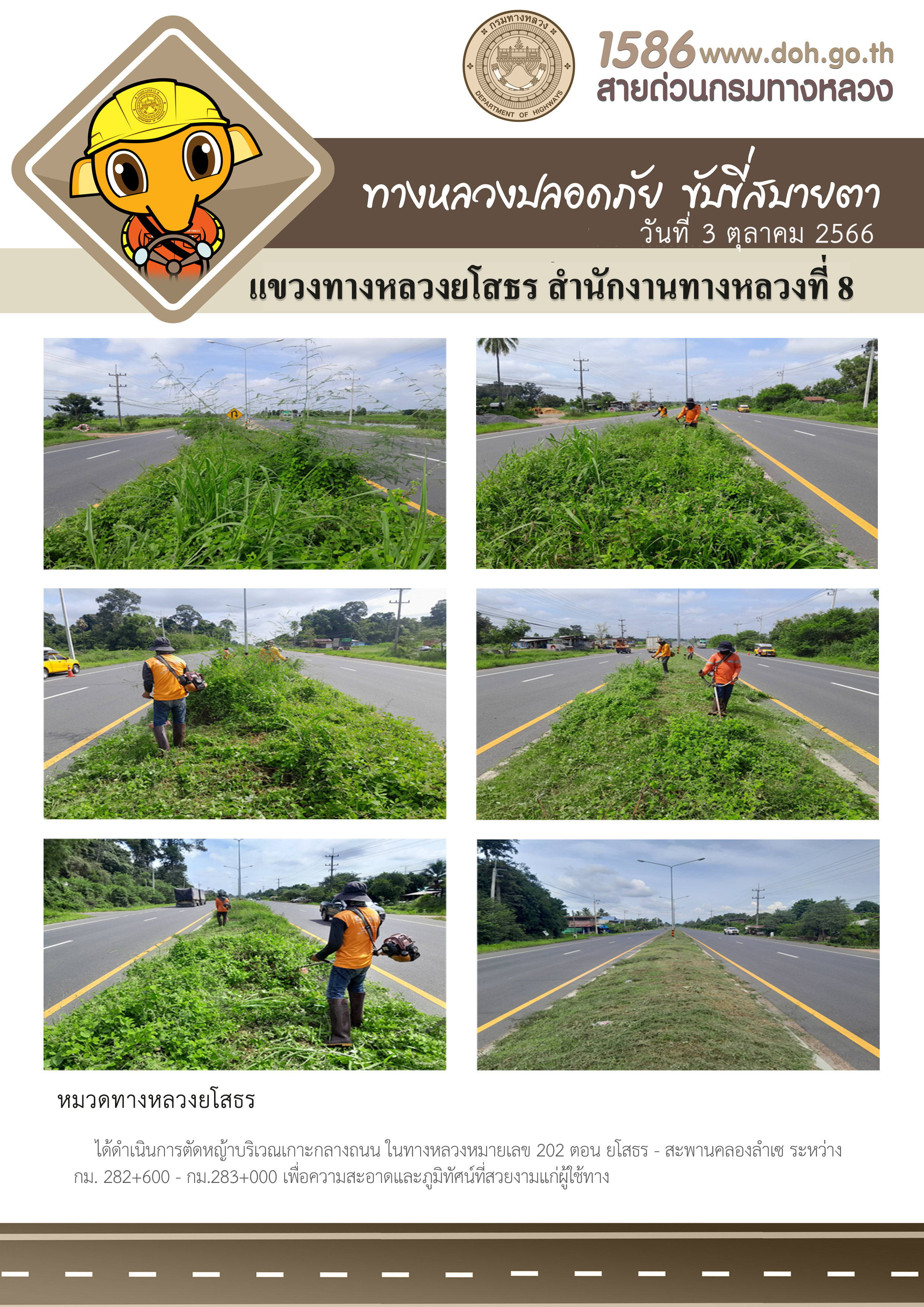 วันที่ 3 ตุลาคม 2566 หมวดทางหลวงยโสธร ได้ดำเนินการตัดหญ้าบริเวณเกาะกลางถนน ในทางหลวงหมายเลข 202 ตอน ยโสธร - สะพานคลองลำเซ ระหว่าง กม.282+600 - กม.283+000 เพื่อความสะอาดและภูมิทัศน์ที่สวยงามแก่ผู้ใช้ทาง
