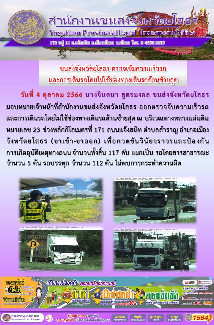 วันที่ 4 ตุลาคม 2566 เจ้าหน้าที่สำนักงานขนส่งจังหวัดยโสธร ออกตั้งจุดตรวจจับความเร็ว