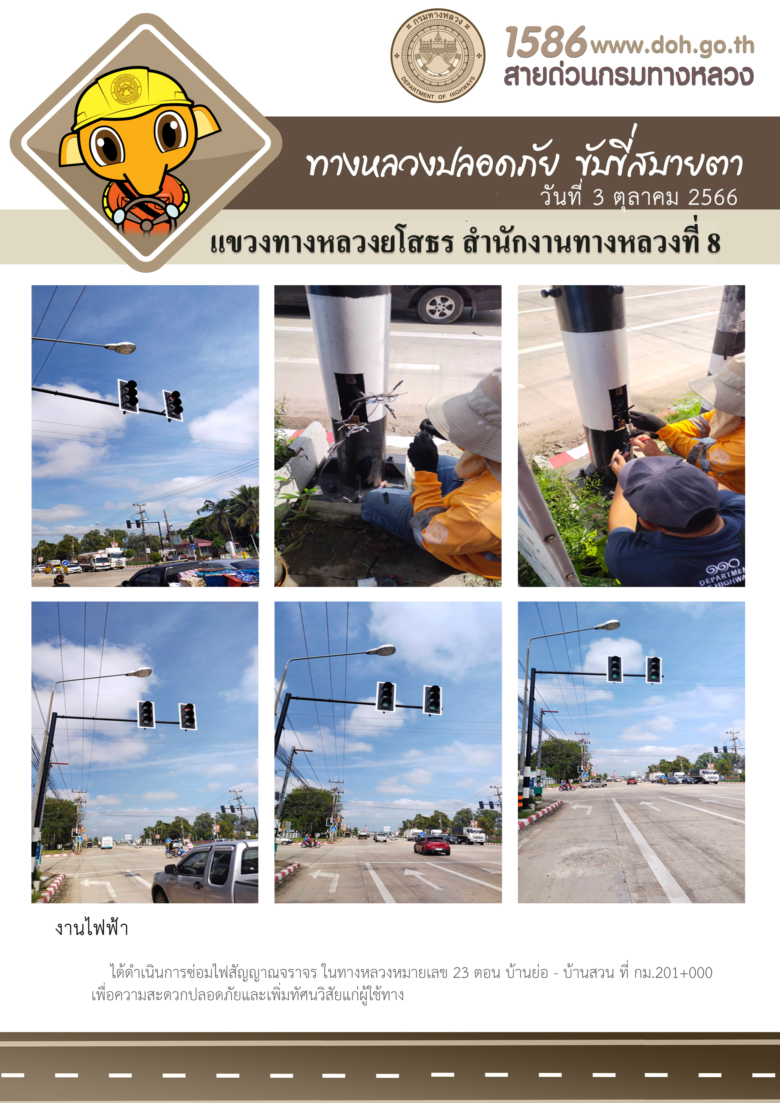 วันที่ 3 ตุลาคม 2566 งานไฟฟ้า ได้ดำเนินการซ่อมไฟสัญญาณจราจร ในทางหลวงหมายเลข 23 ตอน บ้านย่อ - บ้านสวน ที่ กม.201+000 เพื่อความสะดวกปลอดภัยและเพิ่มทัศนวิสัยแก่ผู้ใช้ทาง