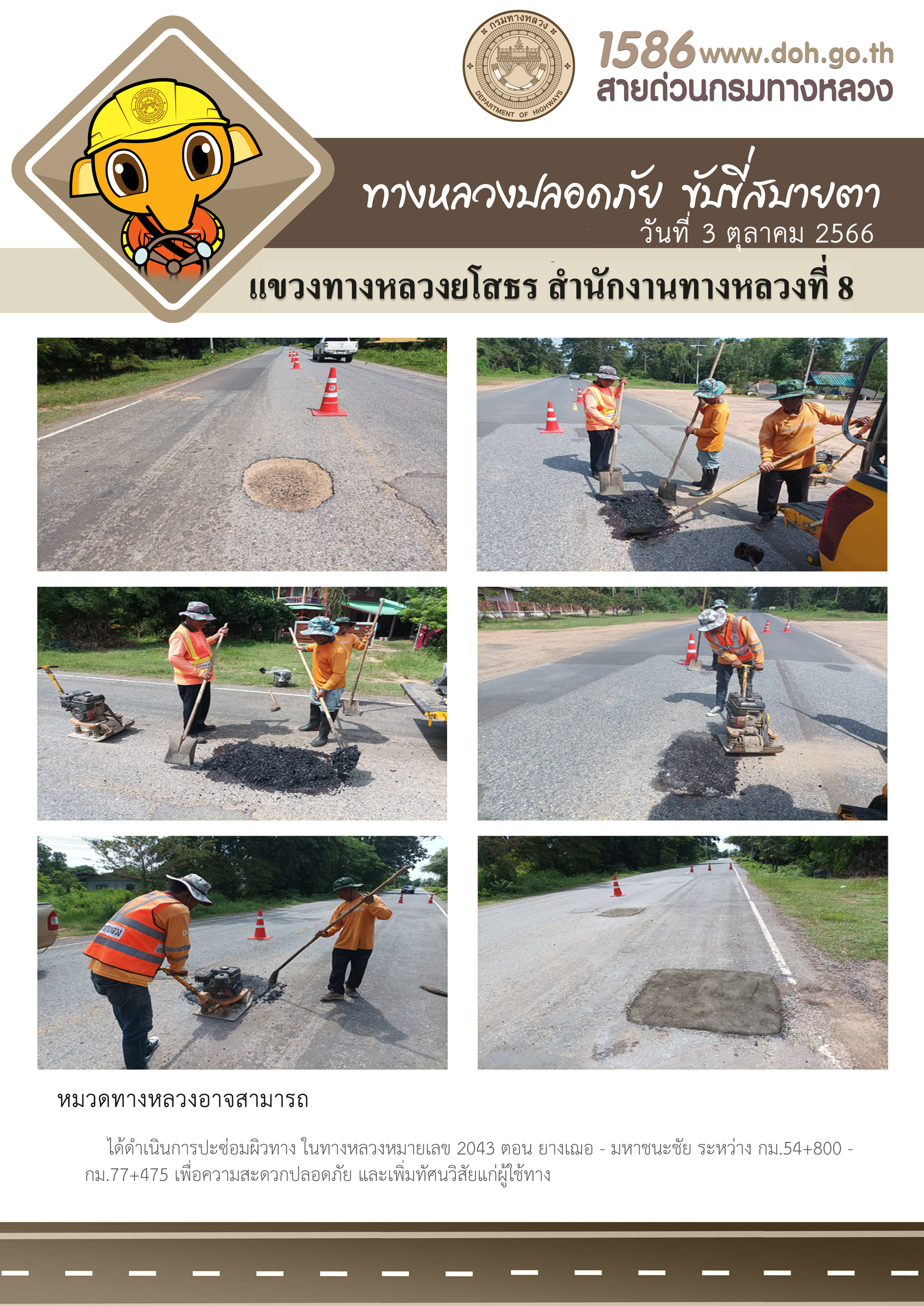 วันที่ 3 ตุลาคม 2566 หมวดทางหลวงอาจสามารถ ได้ดำเนินการปะซ่อมผิวทาง ในทางหลวงหมายเลข 2043 ตอน ยางเฌอ - มหาชนะชัย ระหว่าง กม.54+800 - กม.77+475 เพื่อความสะดวกปลอดภัย และเพิ่มทัศนวิสัยแก่ผู้ใช้ทาง