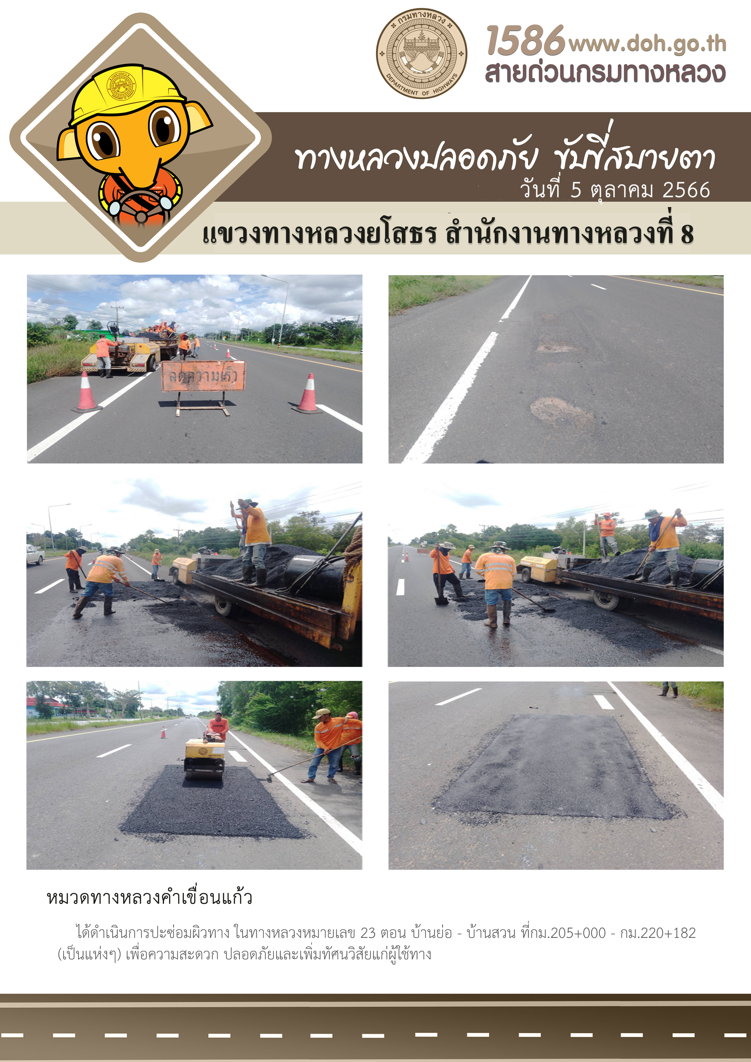วันที่ 5 ตุลาคม 2566 หมวดทางหลวงคำเขื่อนแก้ว ได้ดำเนินการปะซ่อมผิวทาง ในทางหลวงหมายเลข 23 ตอน บ้านย่อ - บ้านสวน ที่ กม.205+000 - กม.220+182 (เป็นแห่งๆ) เพื่อความสะดวก ปลอดภัยและเพิ่มทัศนวิสัยแก่ผู้ใช้ทาง