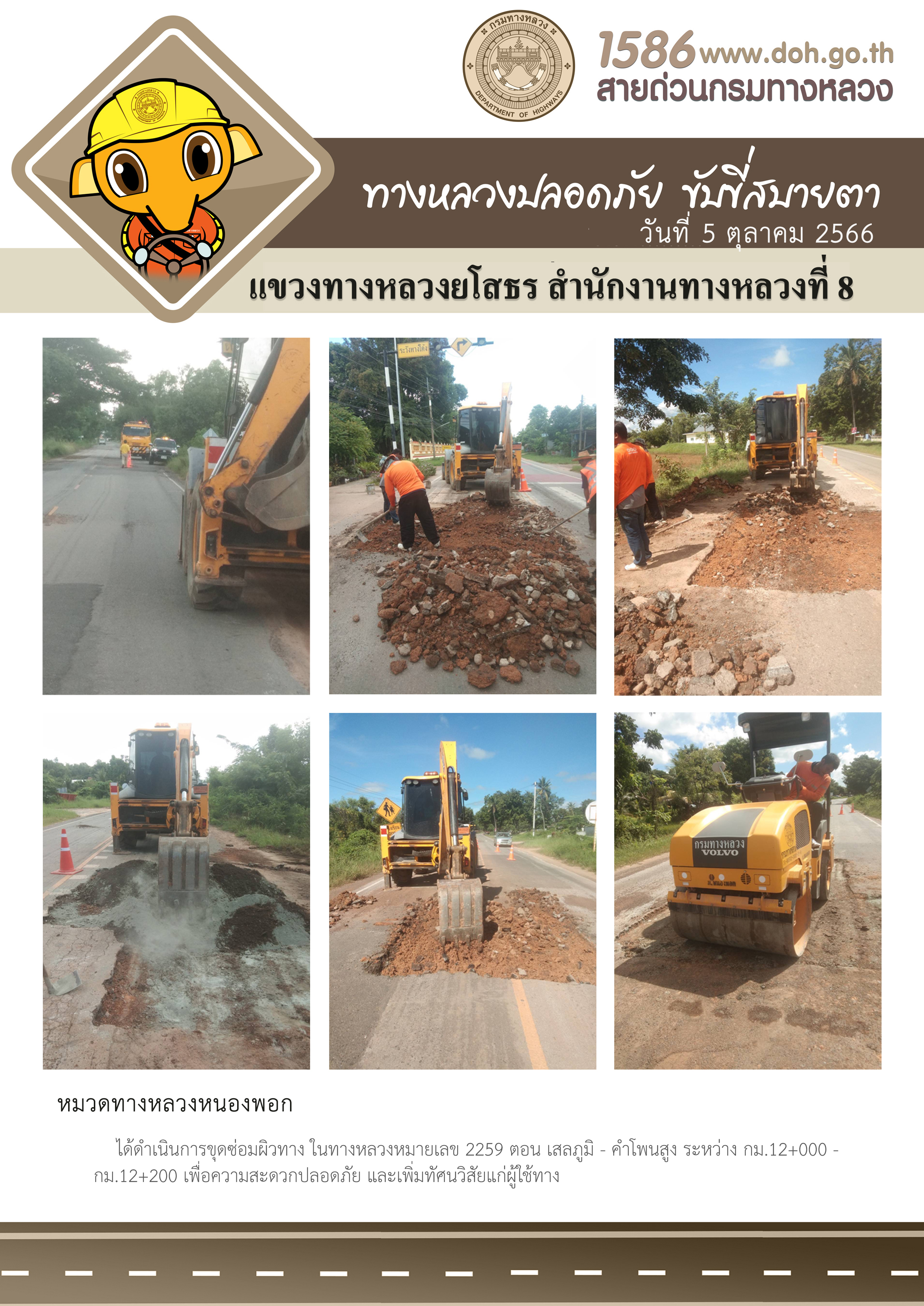 วันที่ 5 ตุลาคม 2566 หมวดทางหลวงหนองพอก ได้ดำเนินการขุดซ่อมผิวทาง ในทางหลวงหมายเลข 2259 ตอน เสลภูมิ - คำโพนสูง ระหว่าง กม.12+000 - กม.12+200 เพื่อความสะดวกปลอดภัย และเพิ่มทัศนวิสัยแก่ผู้ใช้ทาง