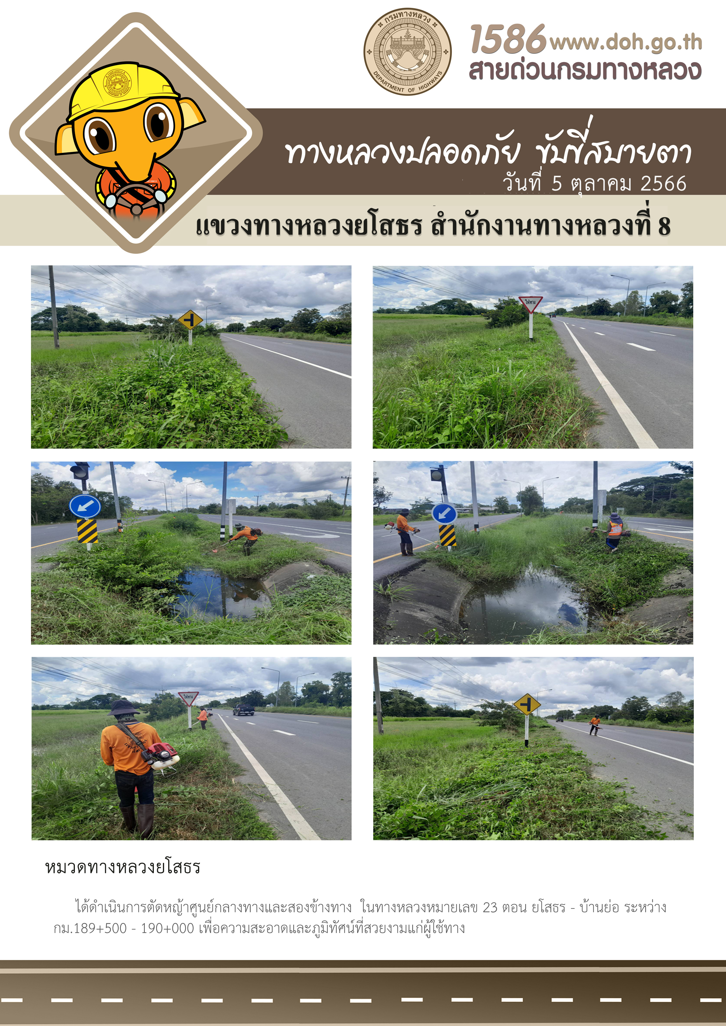 วันที่ 5 ตุลาคม 2566 หมวดทางหลวงยโสธร ได้ดำเนินการตัดหญ้าศูนย์กลางทางและสองข้างทาง ในทางหลวงหมายเลข 23 ตอน ยโสธร - บ้านย่อ ระหว่าง กม.189+500 - กม.190+000 เพื่อความสะอาดและภูมิทัศน์ที่สวยงามแก่ผู้ใช้ทาง