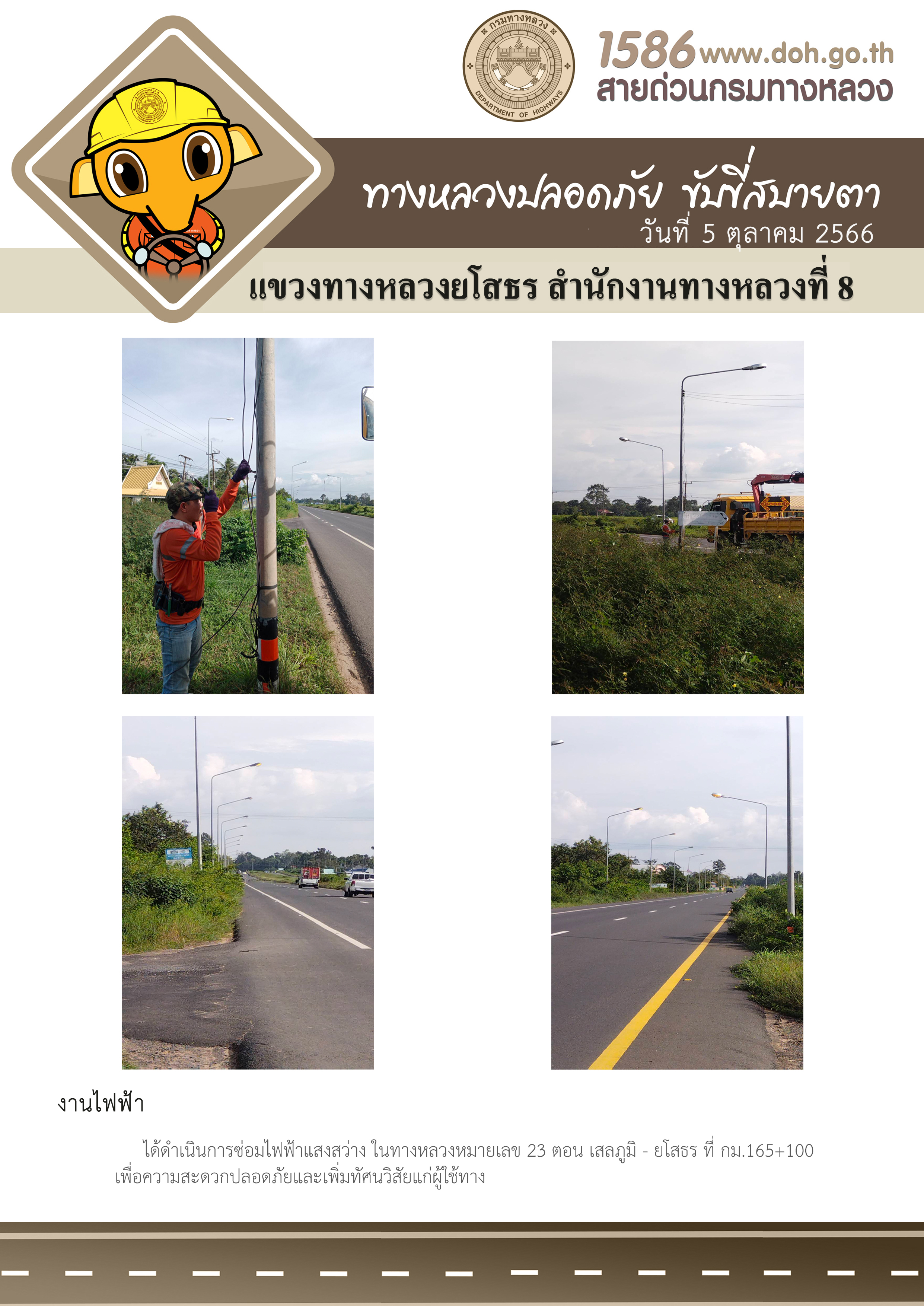 วันที่ 5 ตุลาคม 2566 งานไฟฟ้า ได้ดำเนินการซ่อมไฟฟ้าแสงสว่าง ในทางหลวงหมายเลข 23 ตอน เสลภูมิ - ยโสธร ที่ กม.165+100 เพื่อความสะดวกปลอดภัย และเพิ่มทัศนวิสัยแก่ผู้ใช้ทาง