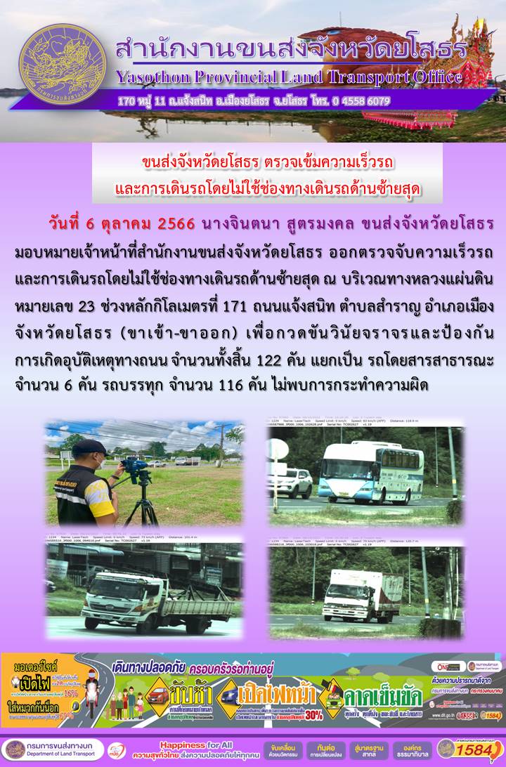 วันที่ 6 ตุลาคม 2566 เจ้าหน้าที่สำนักงานขนส่งจังหวัดยโสธร ออกตั้งจุดตรวจจับความเร็ว