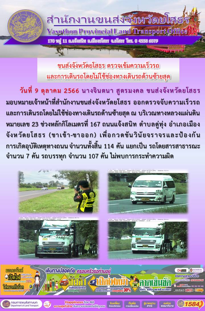 วันที่ 9 ตุลาคม 2566 เจ้าหน้าที่สำนักงานขนส่งจังหวัดยโสธร ออกตั้งจุดตรวจจับความเร็ว