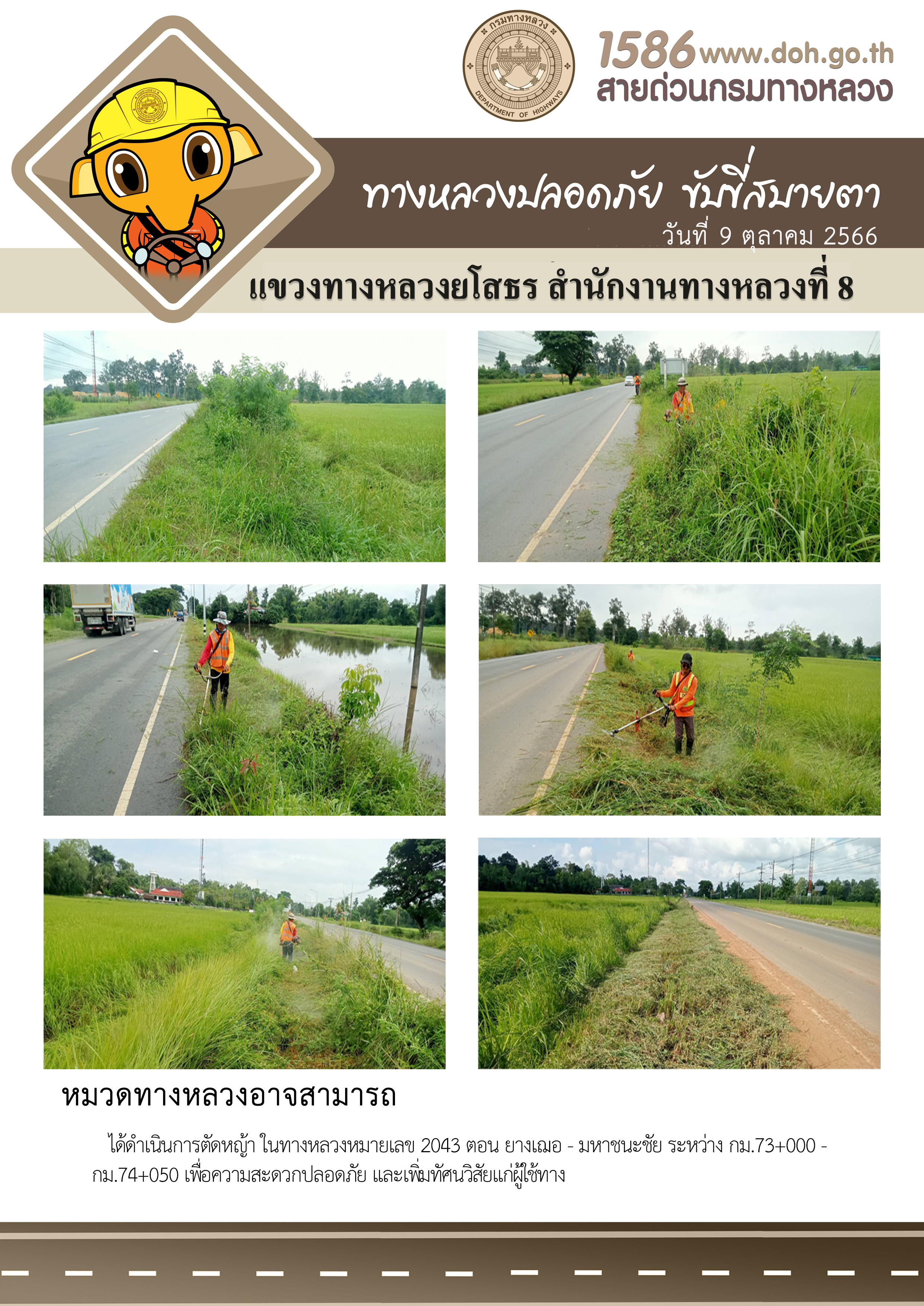 วันที่ 9 ตุลาคม 2566 หมวดทางหลวงอาจสามารถ ได้ดำเนินการตัดหญ้า ในทางหลวงหมายเลข 2043 ตอน ยางเฌอ - มหาชนะชัย ระหว่าง กม.73+000 - กม.74+050 เพื่อความสะดวกปลอดภัย และเพิ่มทัศนวิสัยแก่ผู้ใช้ทาง