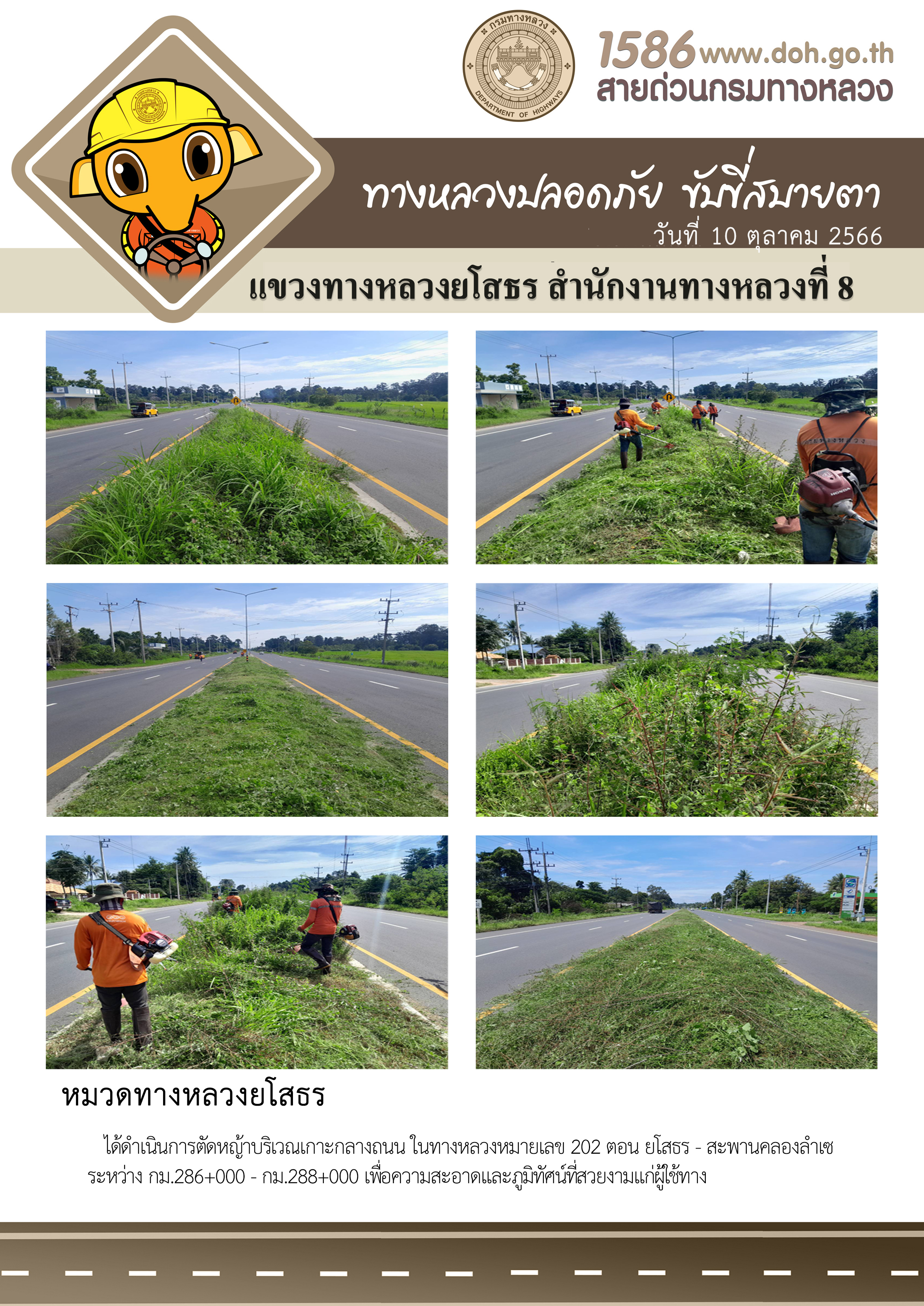 วันที่ 10 ตุลาคม 2566 หมวดทางหลวงยโสธร ได้ดำเนินการตัดหญ้าบริเวณเกาะกลางถนน ในทางหลวงหมายเลข 202 ตอน ยโสธร - สะพานคลองลำเซ ระหว่าง กม.286+000 - กม.288+000 เพื่อความสะอาดและภูมิทัศน์ที่สวยงามแก่ผู้ใช้ทาง