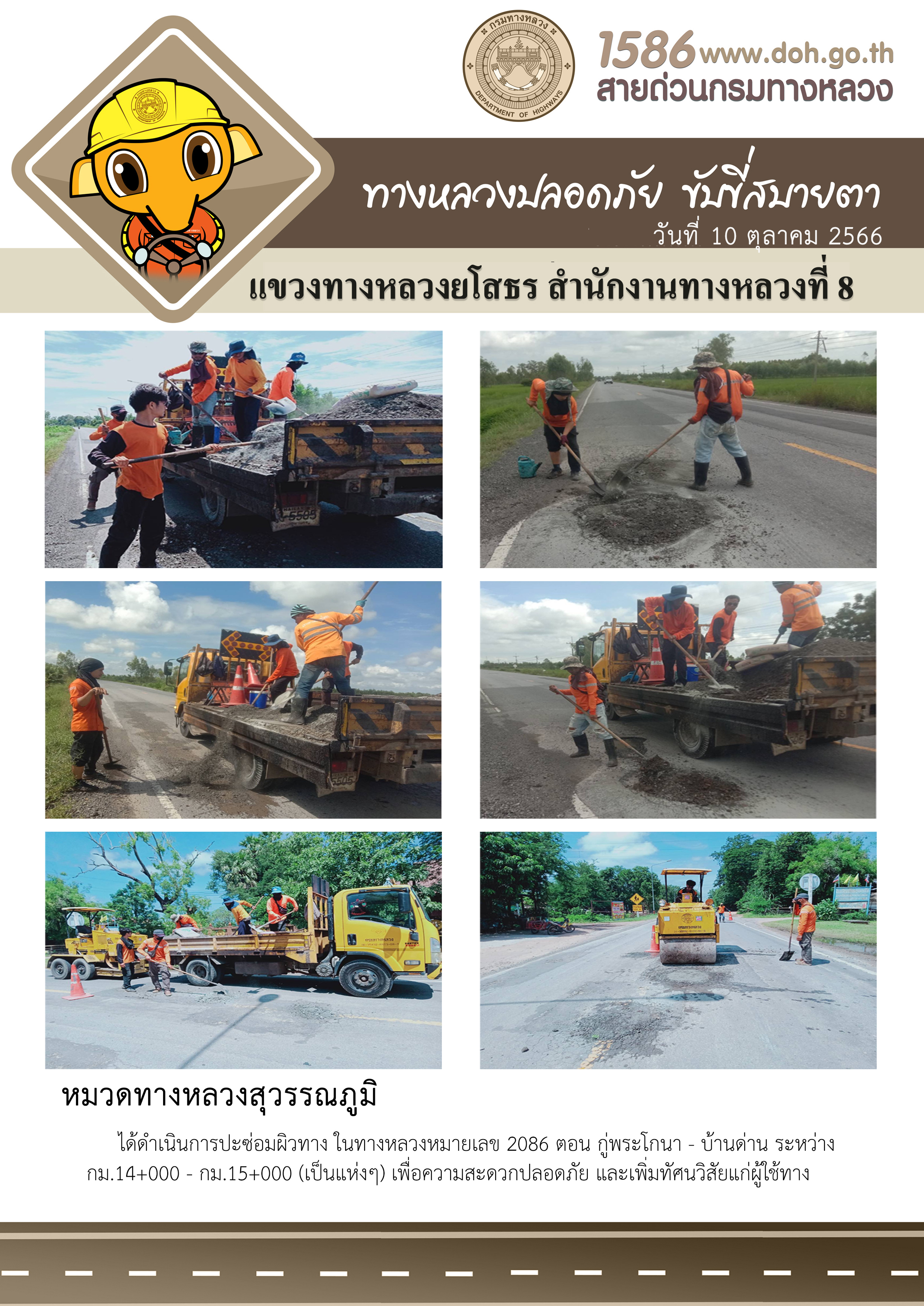 วันที่ 10 ตุลาคม 2566 หมวดทางหลวงสุวรรณภูมิ ได้ดำเนินการปะซ่อมผิวทาง ในทางหลวงหมายเลข 2086 ตอน กู่พระโกนา - บ้านด่าน ระหว่าง กม.14+000 - กม.15+000 (เป็นแห่งๆ) เพื่อความสะดวกปลอดภัย และเพิ่มทัศนวิสัยแก่ผู้ใช้ทาง