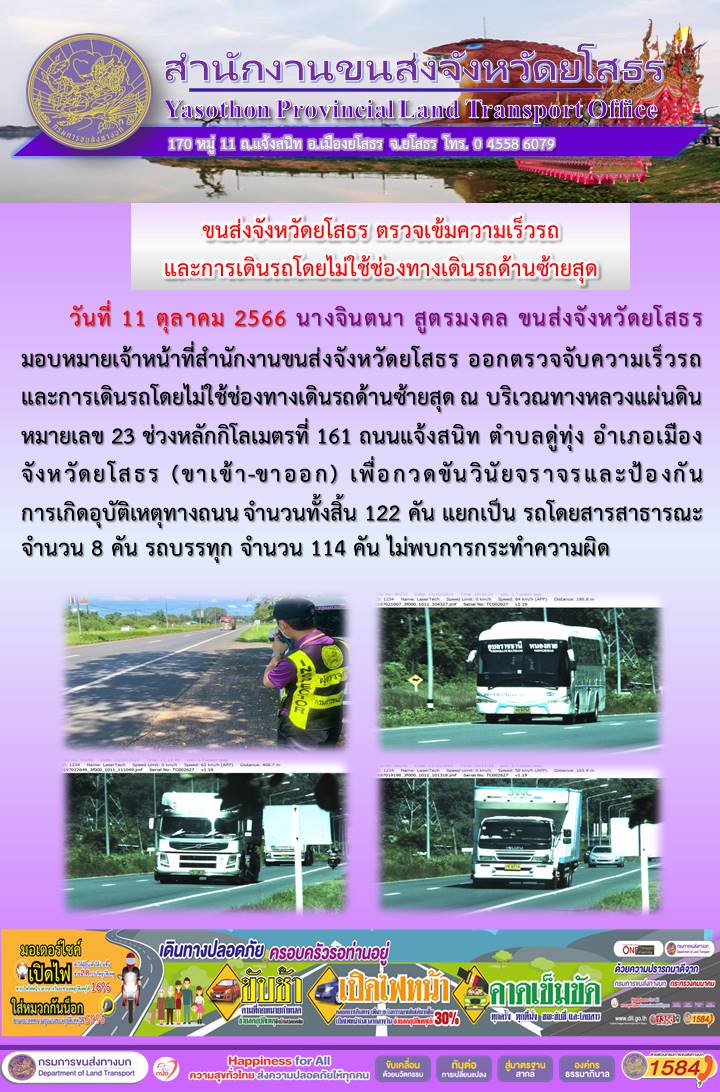วันที่ 11 ตุลาคม 2566 เจ้าหน้าที่สำนักงานขนส่งจังหวัดยโสธร ออกตั้งจุดตรวจจับความเร็ว