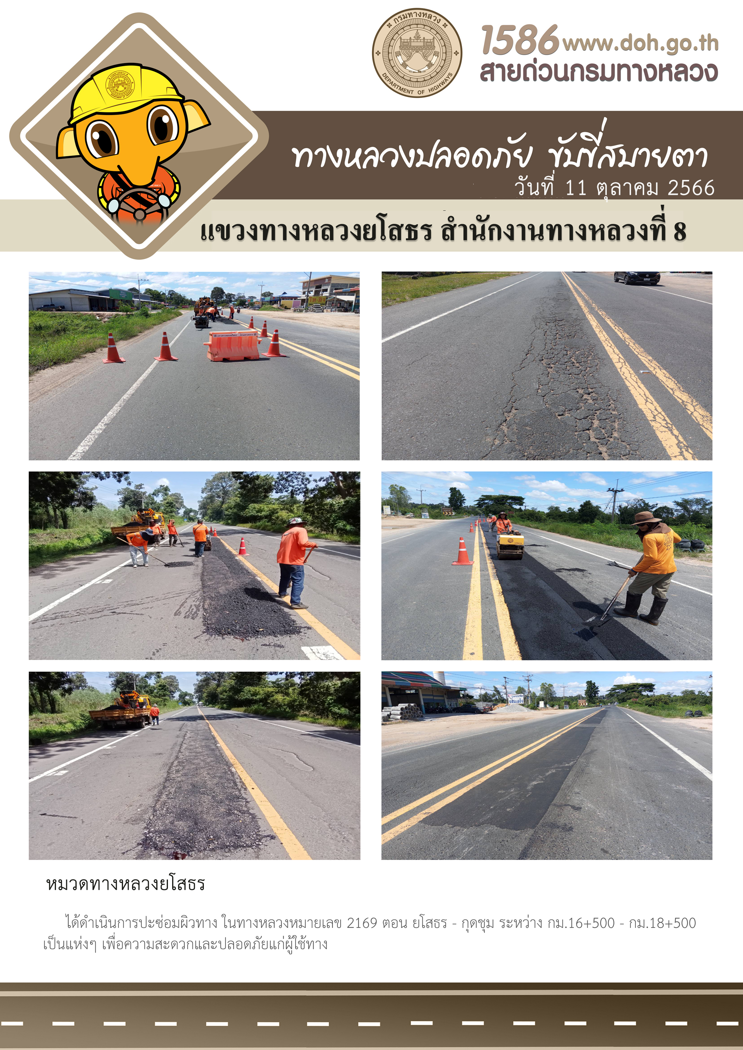 วันที่ 11 ตุลาคม 2566 หมวดทางหลวงยโสธร ได้ดำเนินการปะซ่อมผิวทาง ในทางหลวงหมายเลข 2169 ตอน ยโสธร - กุดชุม ระหว่าง กม.16+500 - กม.18+500 เป็นแห่งๆ เพื่อความสะดวกและปลอดภัยแก่ผู้ใช้ทาง