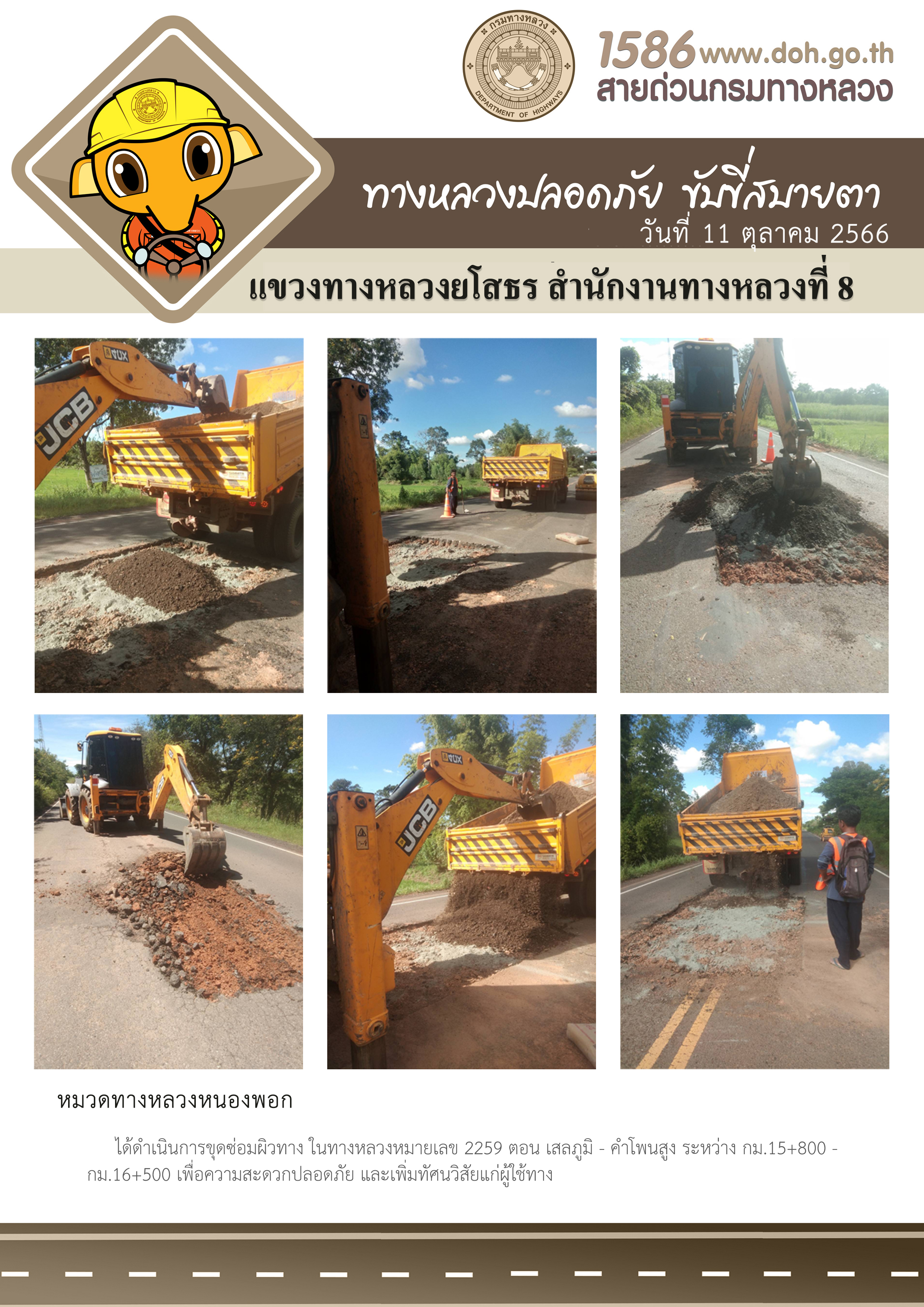 วันที่ 11 ตุลาคม 2566 หมวดทางหลวงหนองพอก ได้ดำเนินการขุดซ่อมผิวทาง ในทางหลวงหมายเลข 2259 ตอน เสลภูมิ - คำโพนสูง ระหว่าง กม.15+800 - กม.16+500 เพื่อความสะดวกปลอดภัย และเพิ่มทัศนวิสัยแก่ผู้ใช้ทาง