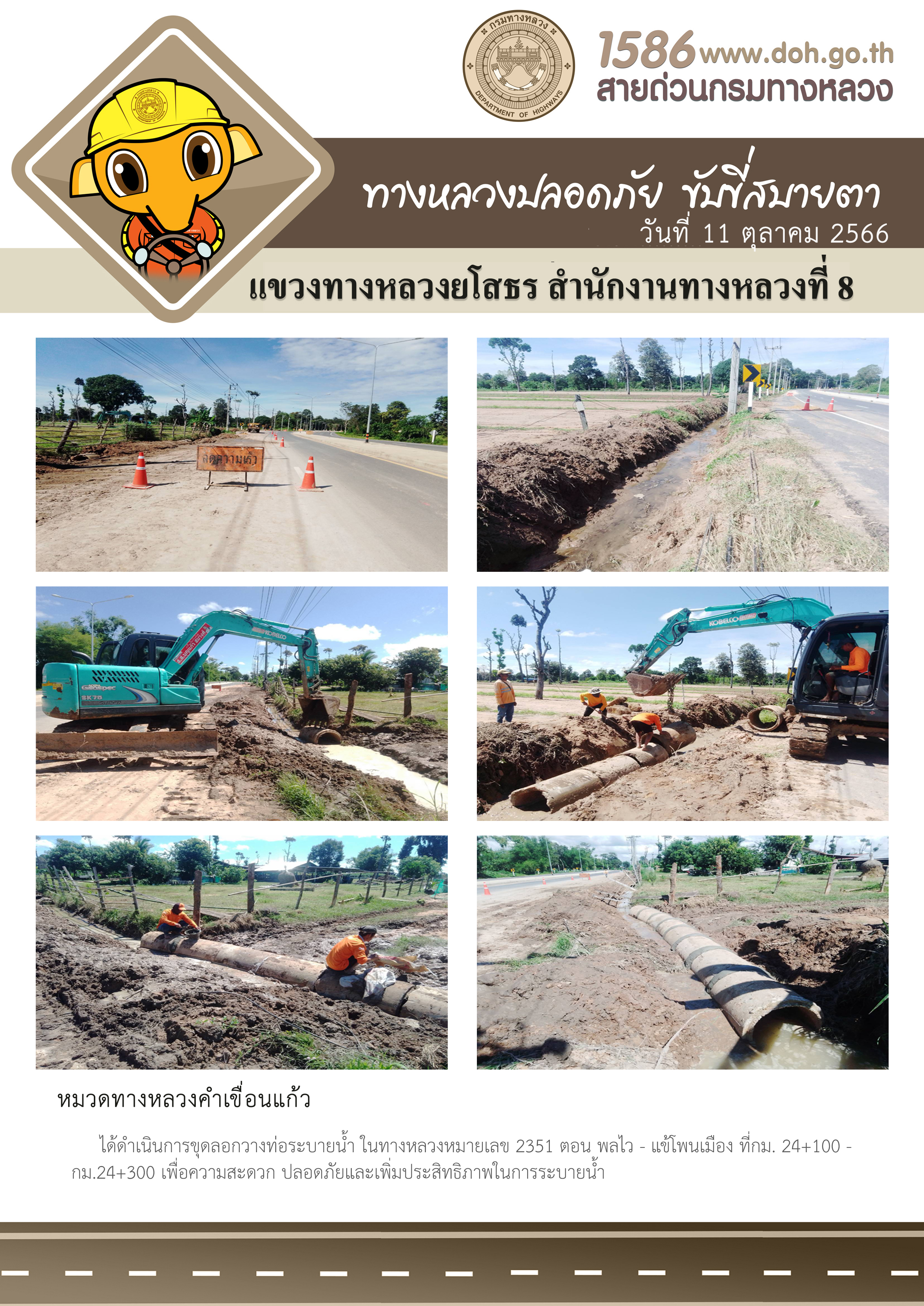 วันที่ 11 ตุลาคม 2566 หมวดทางหลวงคำเขื่อนแก้ว ได้ดำเนินการขุดลอกวางท่อระบายน้ำ ในทางหลวงหมายเลข 2351 ตอน พลไว - แข้โพนเมือง ที่ กม.24+100 - กม.24+300 เพื่อความสะดวก ปลอดภัยและเพิ่มประสิทธิภาพในการระบายน้ำ