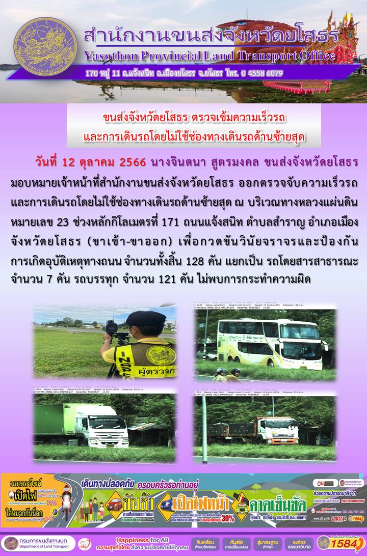 วันที่ 12 ตุลาคม 2566 เจ้าหน้าที่สำนักงานขนส่งจังหวัดยโสธร ออกตั้งจุดตรวจจับความเร็ว
