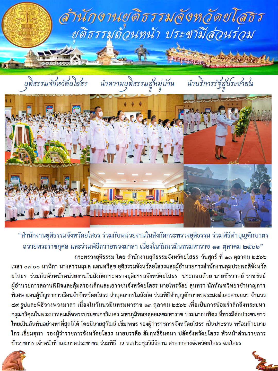 สำนักงานยุติธรรมจังหวัดยโสธร ร่วมกับหน่วยงานในสังกัดกระทรวงยุติธรรม ร่วมพิธีทำบุญตักบาตรถวายพระราชกุศล และร่วมพิธีถวายพวงมาลา เนื่องในวันนวมินทรมหาราช ๑๓ ตุลาคม ๒๕๖๖