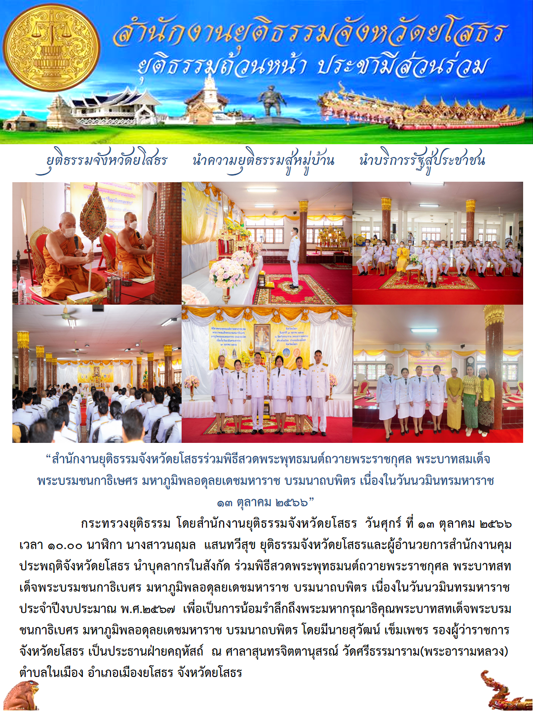 สำนักงานยุติธรรมจังหวัดยโสธรร่วมพิธีสวดพระพุทธมนต์ถวายพระราชกุศล พระบาทสมเด็จพระบรมชนกาธิเษศร มหาภูมิพลอดุลยเดชมหาราช บรมนาถบพิตร เนื่องในวันนวมินทรมหาราช ๑๓ ตุลาคม ๒๕๖๖
