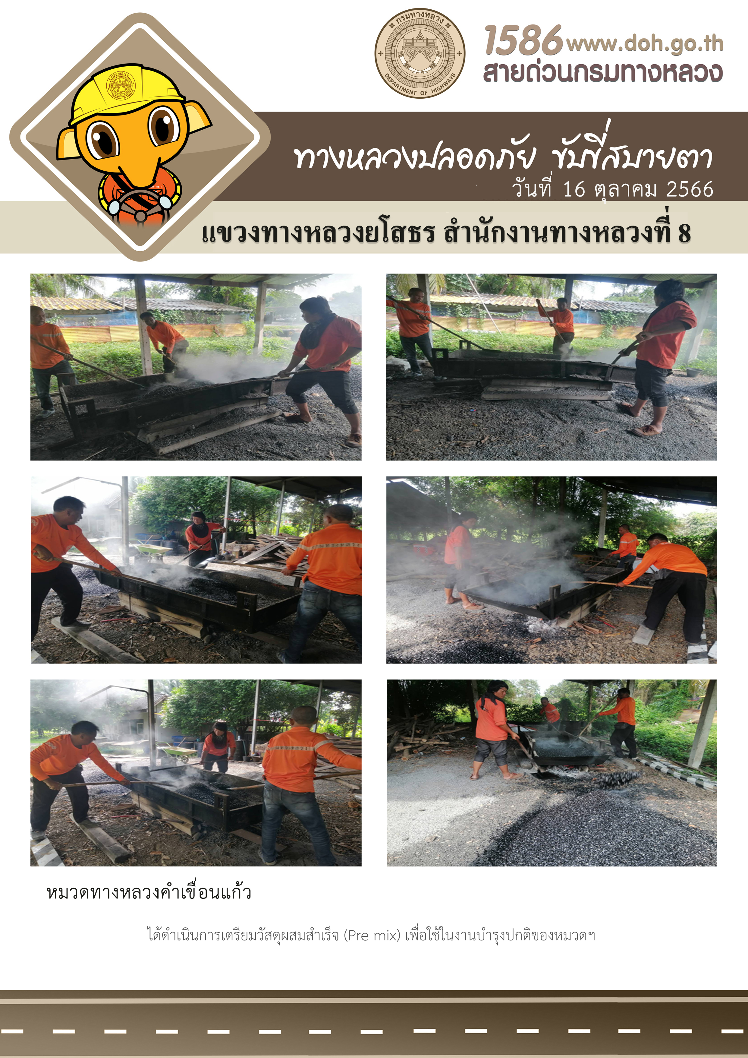 วันที่ 16 ตุลาคม 2566 หมวดทางหลวงคำเขื่อนแก้ว ได้ดำเนินการเตรียมวัสดุผสมสำเร็จ (Pre mix) เพื่อใช้ในงานบำรุงปกติของหมวดฯ