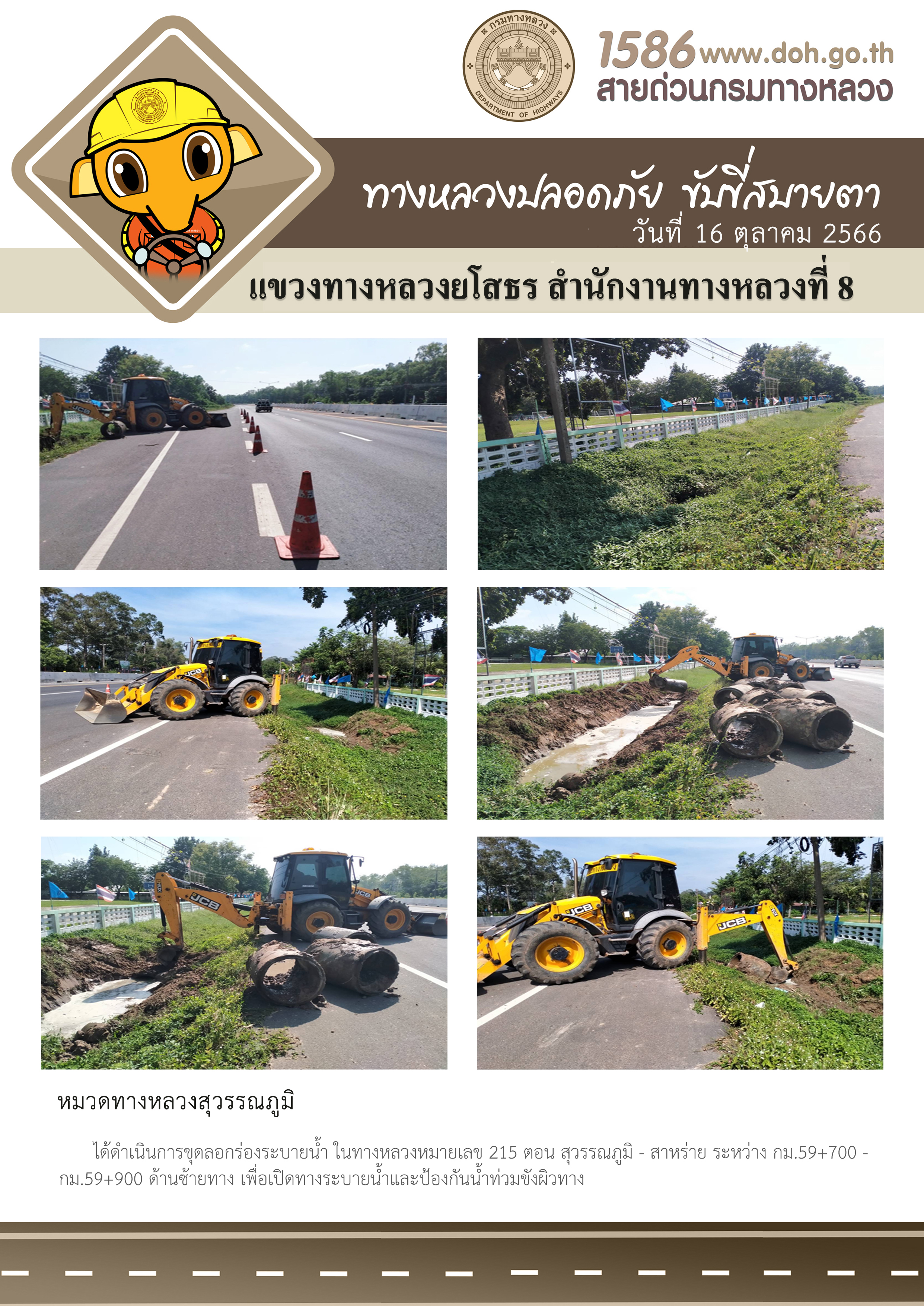 วันที่ 16 ตุลาคม 2566 หมวดทางหลวงสุวรรณภูมิ ได้ดำเนินการขุดลอกร่องระบายน้ำ ในทางหลวงหมายเลข 215 ตอน สุวรรณภูมิ - สาหร่าย ระหว่าง กม.59+700 - กม.59+900 ด้านซ้ายทาง เพื่อเปิดทางระบายน้ำและป้องกันน้ำท่วมขังผิวทาง