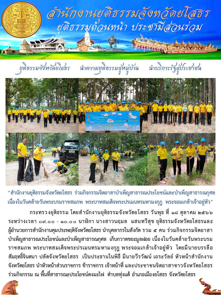 วันที่ 18 ต.ค. 2566 (12:56 น.)กระทรวงยุติธรรม โดยสำนักงานยุติธรรมจังหวัดยโสธร วันพุธ ที่ 18 ตุลาคม 2566 ระหว่างเวลา 09.00 - 10.00 นาฬิกา นางสาวนฤมล แสนทวีสุข ยุติธรรมจังหวัดยโสธรและผู้อำนวยการสำนักงานคุมประพฤติจังหวัดยโสธร นำบุคลากรในสังกัด รวม 5 คน ร่วมกิจกรรมจิตอาสาบำเพ็ญสาธารณประโยชน์และบำเพ็ญสาธารณกุศล เก็บกวาดขยะมูลฝอย เนื่องในวันคล้ายวันพระบรมราชสมภพ พระบาทสมเด็จพระปรเมนทรมหามงกุฎ พระจอมเกล้าเจ้าอยู่หัว โดยมีนายบรรลือ สัมฤทธิ์จินตนา ปลัดจังหวัดยโสธร เป็นประธานในพิธี มีนายวีรวัฒน์ เถระวัลย์ หัวหน้าสำนักงานจังหวัดยโสธร นำหัวหน้าส่วนราชการ ข้าราชการ เจ้าหน้าที่ และประชาชนจิตอาสาชาวจังหวัดยโสธร ร่วมกิจกรรม ณ พื้นที่สาธารณะประโยชน์ดงมะไฟ ตำบลทุ่งแต้ อำเภอเมืองยโสธร จังหวัดยโสธร
