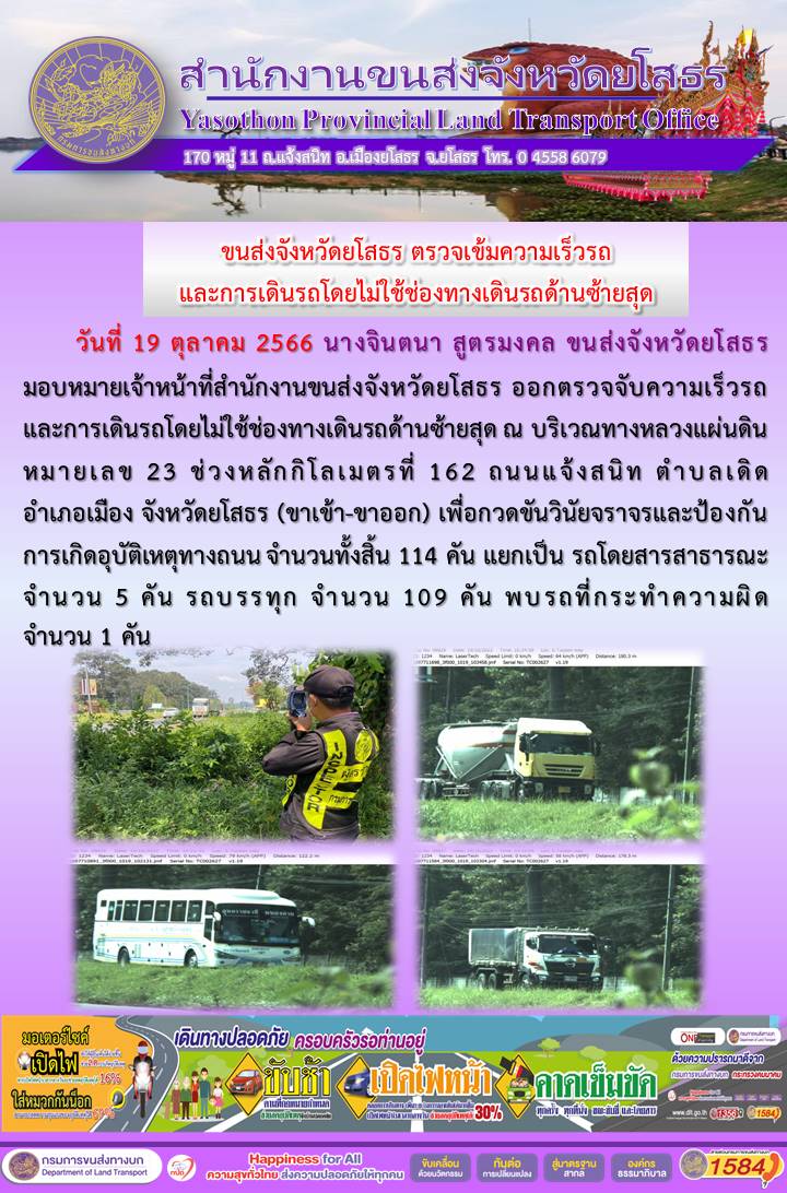 วันที่ 19 ตุลาคม 2566 เจ้าหน้าที่สำนักงานขนส่งจังหวัดยโสธร ออกตั้งจุดตรวจจับความเร็ว