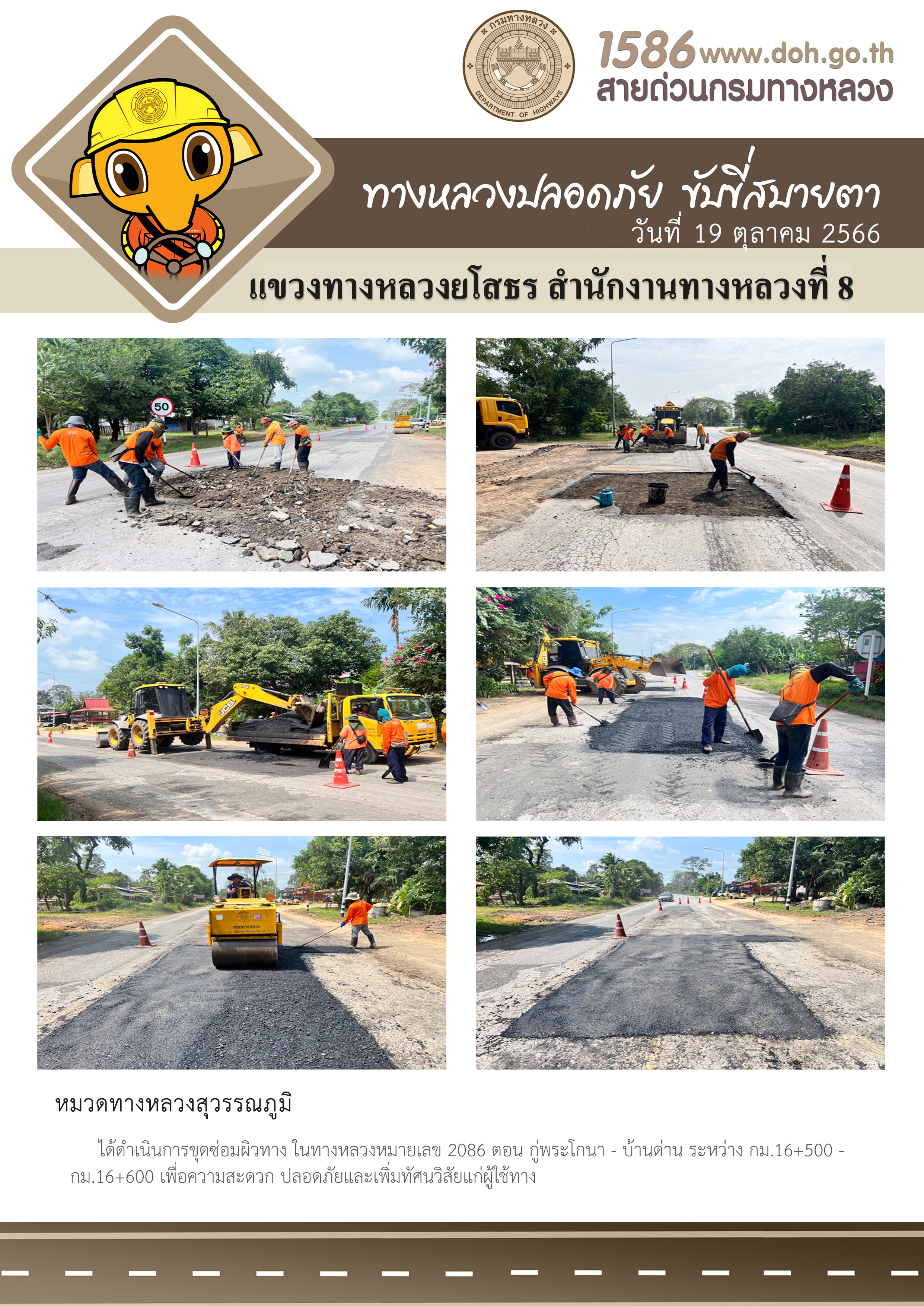 วันที่ 19 ตุลาคม 2566 หมวดทางหลวงสุวรรณภูมิ ได้ดำเนินการขุดซ่อมผิวทาง ในทางหลวงหมายเลข 2086 ตอน กู่พระโกนา - บ้านด่าน ระหว่าง กม.16+500 - กม.16+600 เพื่อความสะดวก ปลอดภัยและเพิ่มทัศนวิสัยแก่ผู้ใช้ทาง