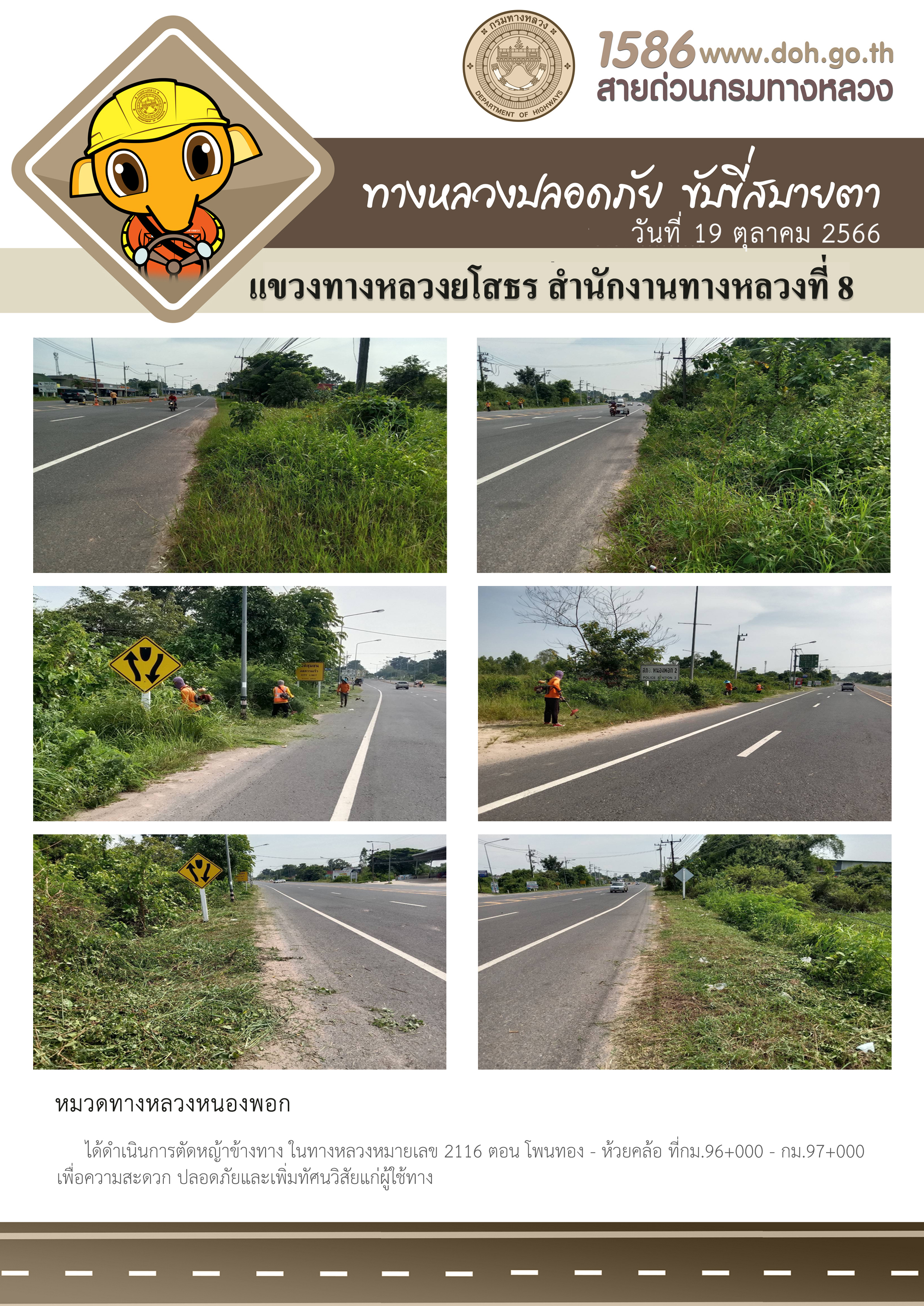 วันที่ 19 ตุลาคม 2566 หมวดทางหลวงหนองพอก ได้ดำเนินการตัดหญ้าข้างทาง ในทางหลวงหมายเลข 2116 ตอน โพนทอง - ห้วยคล้อ ที่ กม.96+000 - กม.97+000 เพื่อความสะดวก ปลอดภัยและเพิ่มทัศนวิสัยแก่ผู้ใช้ทาง