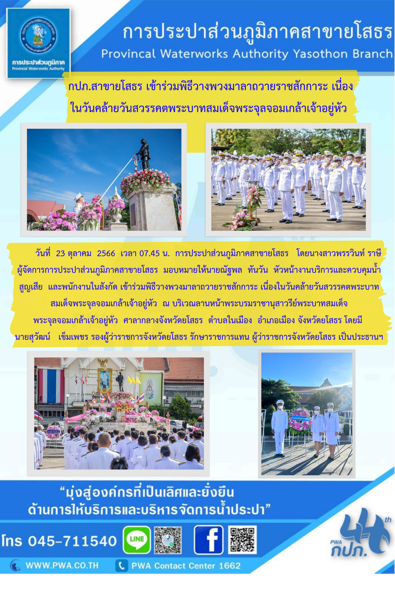 วันที่ 23 ต.ค. 2566 (15:45 น.)วันที่ 23 ตุลาคม 2566 เวลา 07.45 น. การประปาส่วนภูมิภาคสาขายโสธร โดยนางสาวพรรวินท์ ราษี ผู้จัดการการประปาส่วนภูมิภาคสาขายโสธร มอบหมายให้นายณัฐพล ทันวัน หัวหน้างานบริการและควบคุมน้ำสูญเสีย และพนักงานในสังกัด เข้าร่วมพิธีวางพวงมาลาถวายราชสักการะ เนื่องในวันคล้ายวันสวรรคตพระบาทสมเด็จพระจุลจอมเกล้าเจ้าอยู่หัว ณ บริเวณลานหน้าพระบรมราชานุสาวรีย์พระบาทสมเด็จ