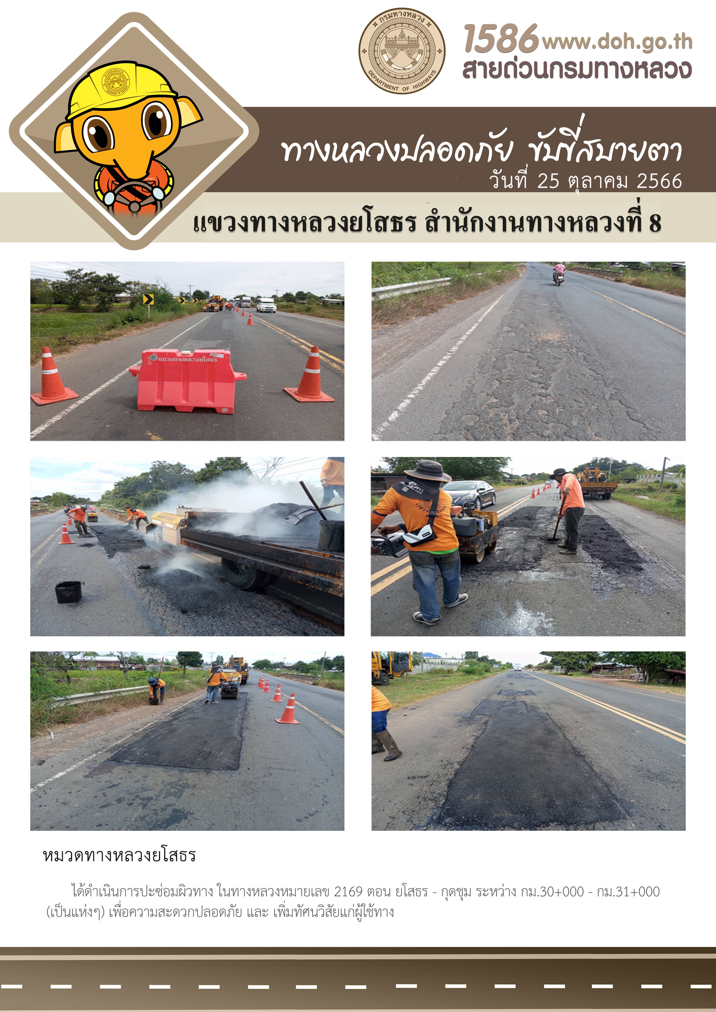 วันที่ 25 ตุลาคม 2566 หมวดทางหลวงยโสธร ได้ดำเนินการปะซ่อมผิวทาง ในทางหลวงหมายเลข 2169 ตอน ยโสธร - กุดชุม ระหว่าง กม.30+000 - กม.31+000 (เป็นแห่งๆ) เพื่อความสะดวกปลอดภัย และเพิ่มทัศนวิสัยแก่ผู้ใช้ทาง