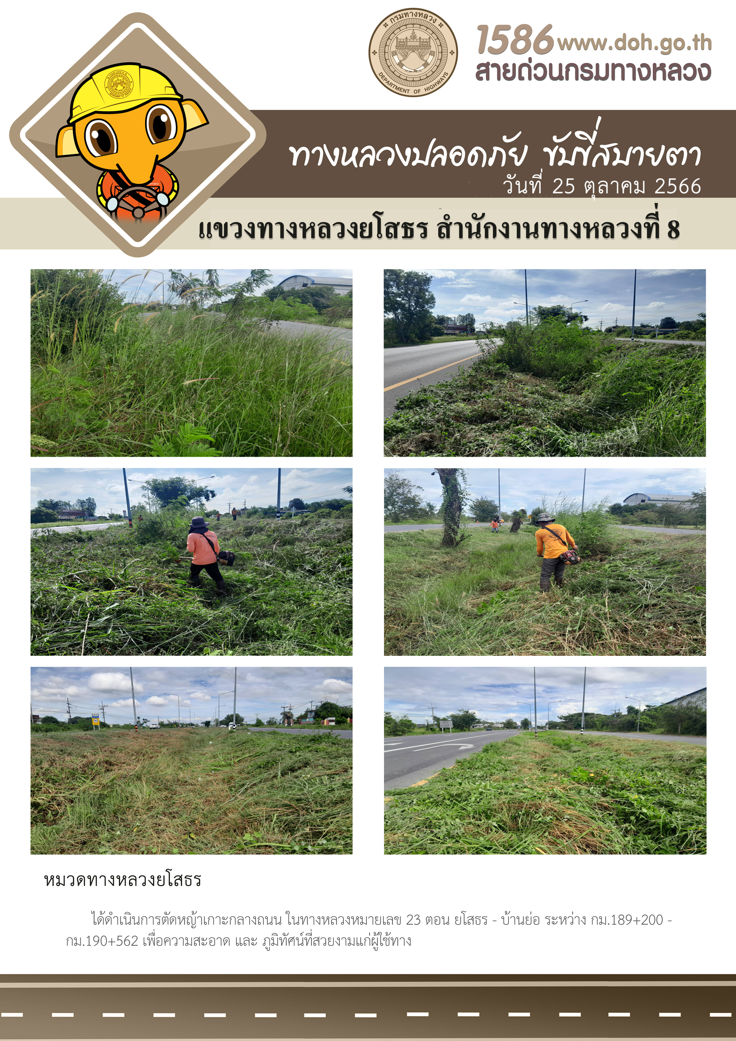 วันที่ 25 ตุลาคม 2566 หมวดทางหลวงยโสธร ได้ดำเนินการตัดหญ้าเกาะกลางถนน ในทางหลวงหมายเลข 23 ตอน ยโสธร - บ้านย่อ ระหว่าง กม.189+200 - กม.190 +562 เพื่อความสะอาด และภูมิทัศน์ที่สวยงามแก่ผู้ใช้ทาง