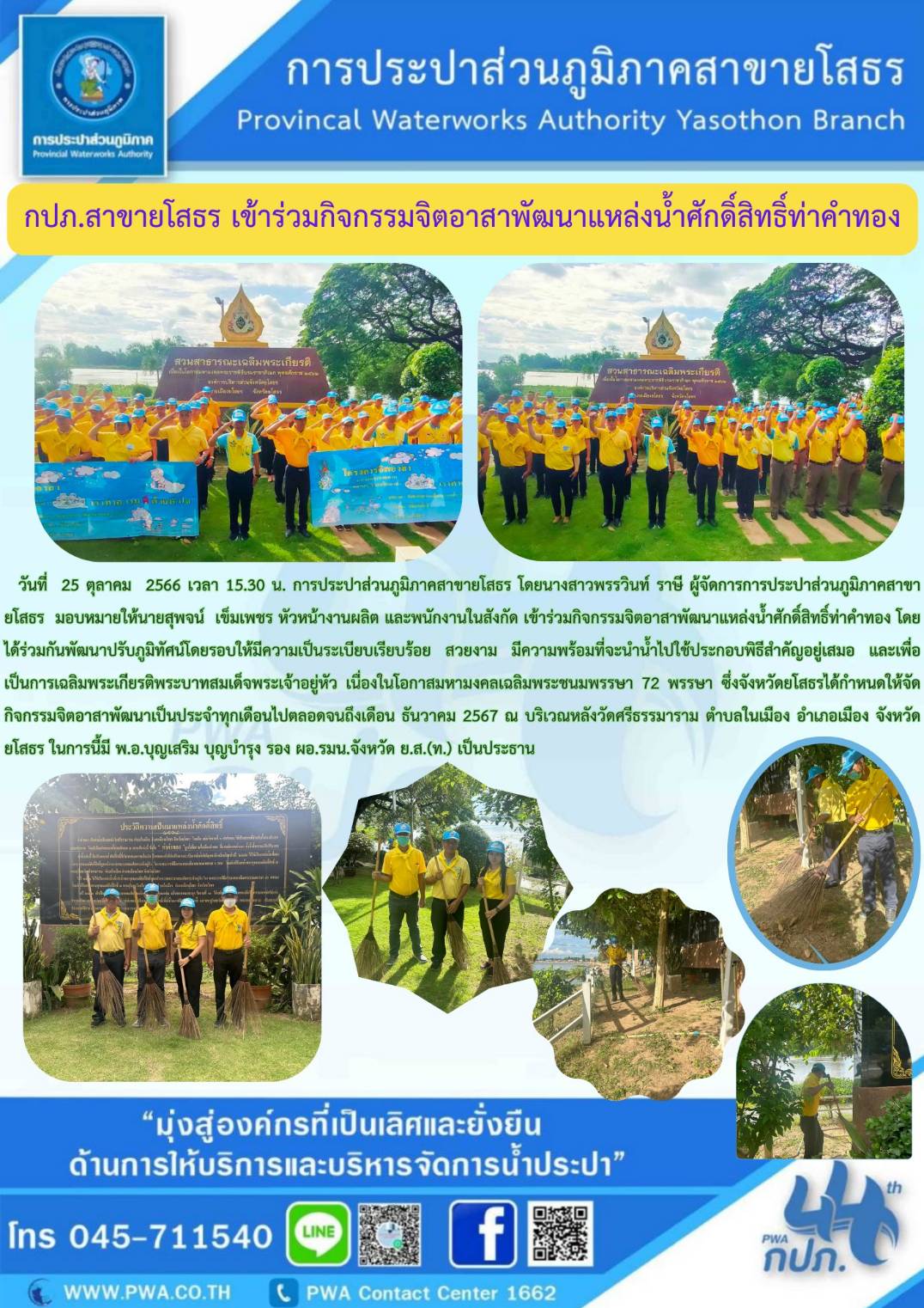 วันที่ 26 ต.ค. 2566 (10:17 น.)วันที่ 25 ตุลาคม 2566 เวลา 15.30 น. การประปาส่วนภูมิภาคสาขายโสธร โดยนางสาวพรรวินท์ ราษี ผู้จัดการการประปาส่วนภูมิภาคสาขายโสธร มอบหมายให้นายสุพจน์ เข็มเพชร หัวหน้างานผลิต และพนักงานในสังกัด เข้าร่วมกิจกรรมจิตอาสาพัฒนาแหล่งน้ำศักดิ์สิทธิ์ท่าคำทอง โดยได้ร่วมกันพัฒนาปรับภูมิทัศน์โดยรอบให้มีความเป็นระเบียบเรียบร้อย สวยงาม มีความพร้อมที่จะนำน้ำไปใช้ประกอบพิธีสำคัญอยู่เสมอ และเพื่อเป็นการเฉลิมพระเกียรติพระบาทสมเด็จพระเจ้าอยู่หัว เนื่องในโอกาสมหามงคลเฉลิมพระชนมพรรษา 72 พรรษา ซึ่งจังหวัดยโสธรได้กำหนดให้จัดกิจกรรมจิตอาสาพัฒนาเป็นประจำทุกเดือนไปตลอดจนถึงเดือน ธันวาคม 2567 ณ บริเวณหลังวัดศรีธรรมาราม ตำบลในเมือง อำเภอเมือง จังหวัดยโสธร ในการนี้มี พ.อ.บุญเสริม บุญบำรุง รอ ผอ.รมน.จังหวัด ย.ส. (ท.) เป็นประธาน