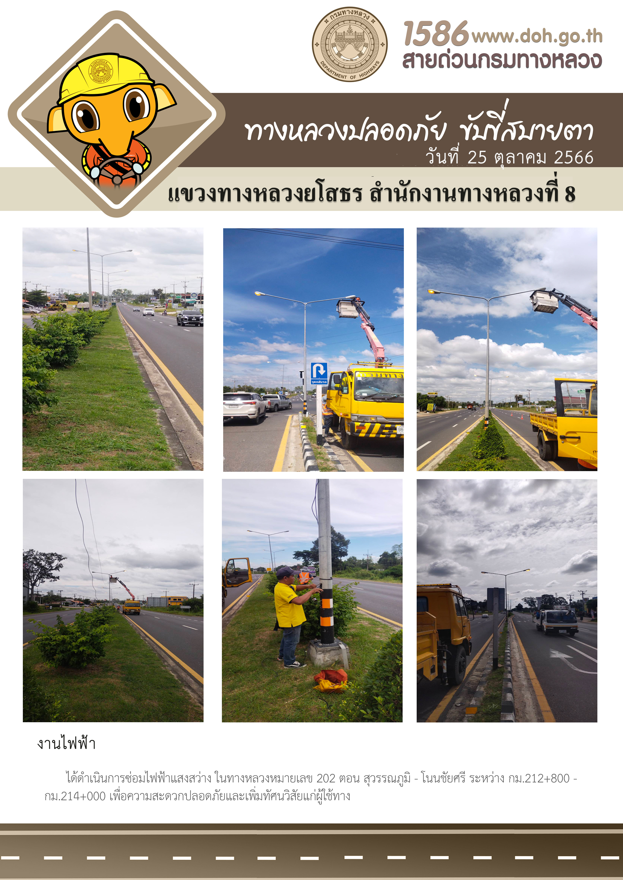 วันที่ 25 ตุลาคม 2566 งานไฟฟ้า ได้ดำเนินการซ่อมไฟฟ้าแสงสว่าง ในทางหลวงหมายเลข 202 ตอน สุวรรณภูมิ - โนนชัยศรี ระหว่าง กม.212+800 - กม.214+000 เพื่อความสะดวกปลอดภัยและเพิ่มทัศนวิสัยแก่ผู้ใช้ทาง