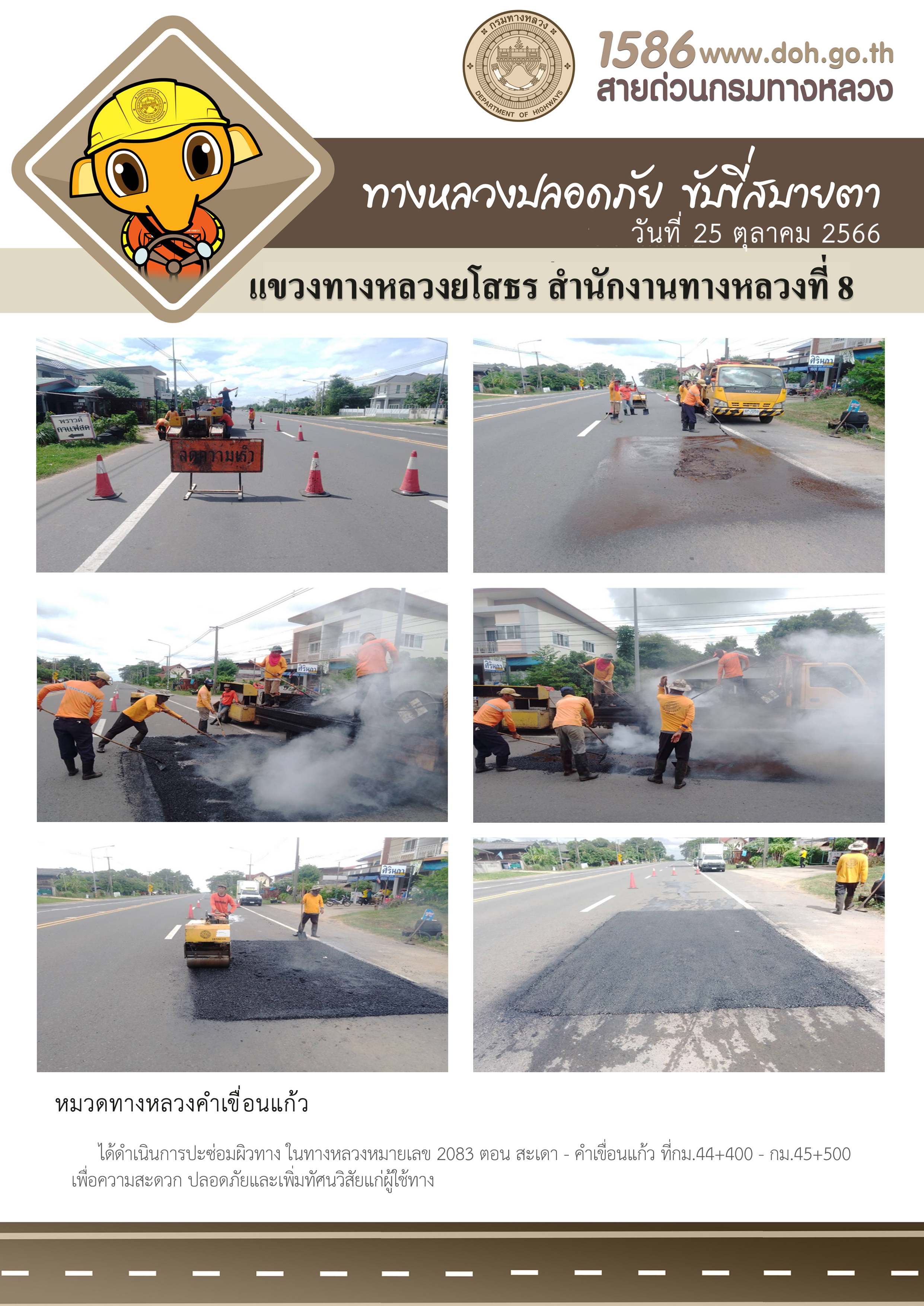 วันที่ 25 ตุลาคม 2566 หมวดทางหลวงคำเขื่อนแก้ว ได้ดำเนินการปะซ่อมผิวทาง ในทางหลวงหมายเลข 2083 ตอน สะเดา - คำเขื่อนแก้ว ที่ กม.44+400 - กม.45+500 เพื่อความสะดวก ปลอดภัยและเพิ่มทัศนวิสัยแก่ผู้ใช้ทาง
