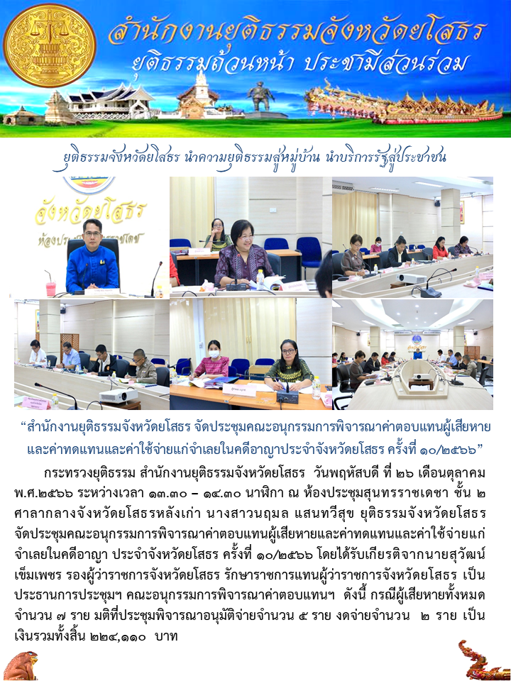 วันที่ 27 ต.ค. 2566 (09:58 น.)กระทรวงยุติธรรม สำนักงานยุติธรรมจังหวัดยโสธร วันพฤหัสบดี ที่ 26 เดือนตุลาคม พ.ศ.2566 ระหว่างเวลา 13.30 – 14.30 นาฬิกา ณ ห้องประชุมสุนทรราชเดชา ชั้น 2 ศาลากลางจังหวัดยโสธรหลังเก่า นางสาวนฤมล แสนทวีสุข ยุติธรรมจังหวัดยโสธร จัดประชุมคณะอนุกรรมการพิจารณาค่าตอบแทนผู้เสียหายและค่าทดแทนและค่าใช้จ่ายแก่จำเลยในคดีอาญา ประจำจังหวัดยโสธร ครั้งที่ 10/2566 โดยได้รับเกียรติจากนายสุวัฒน์ เข็มเพชร รองผู้ว่าราชการจังหวัดยโสธร รักษาราชการแทนผู้ว่าราชการจังหวัดยโสธร เป็นประธานการประชุมฯ คณะอนุกรรมการพิจารณาค่าตอบแทนฯ ดังนี้ กรณีผู้เสียหายทั้งหมดจำนวน 7 ราย มติที่ประชุมพิจารณาอนุมัติจ่ายจำนวน 5 ราย งดจ่ายจำนวน 2 ราย เป็นเงินรวมทั้งสิ้น 224,110 บาท