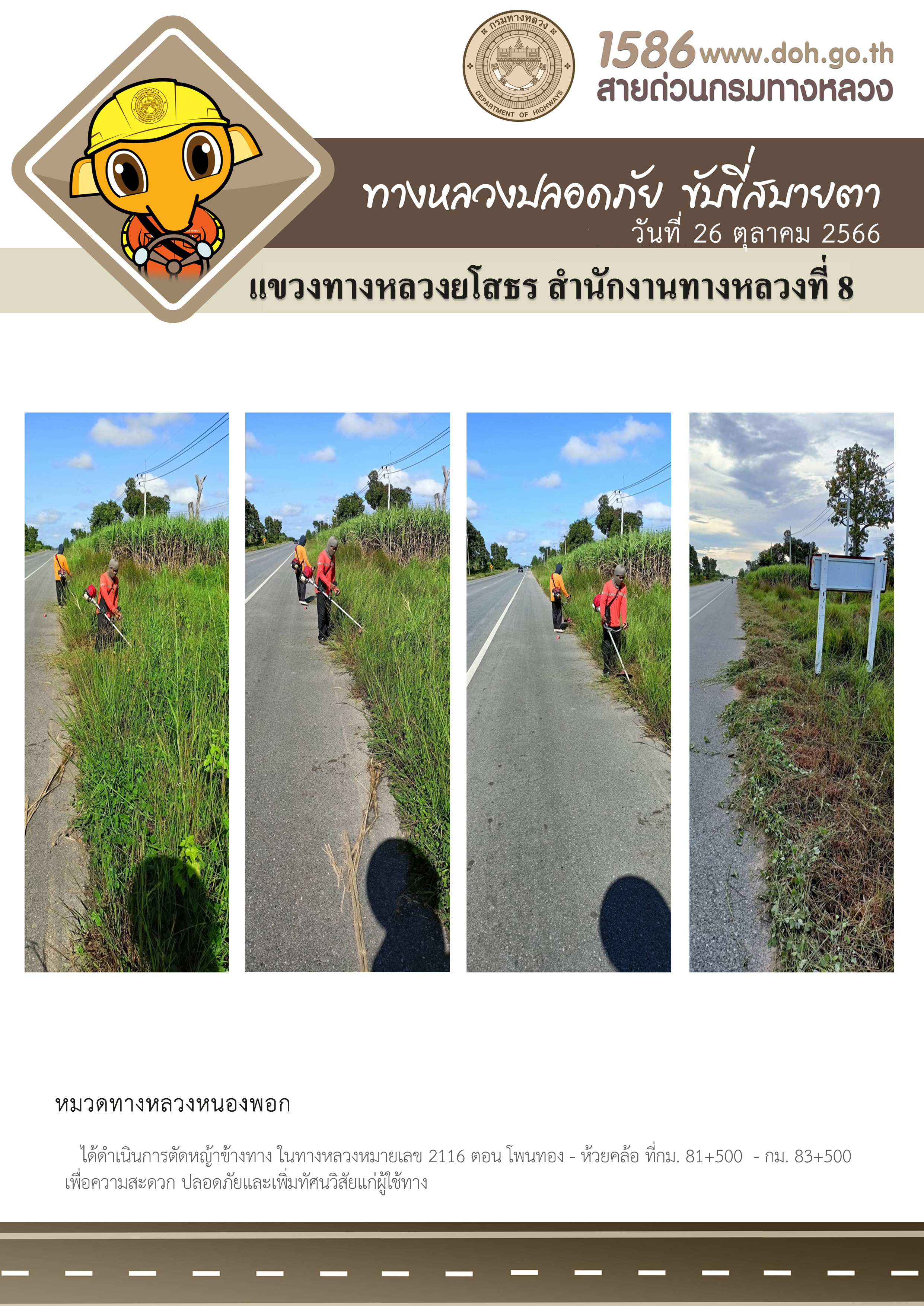 วันที่ 26 ตุลาคม 2566 หมวดทางหลวงหนองพอก ได้ดำเนินการตัดหญ้าข้างทาง ในทางหลวงหมายเลข 2116 ตอน โพนทอง - ห้วยคล้อ ที่ กม.81+500 - กม.83+500 เพื่อความสะดวก ปลอดภัยและเพิ่มทัศนวิสัยแก่ผู้ใช้ทาง