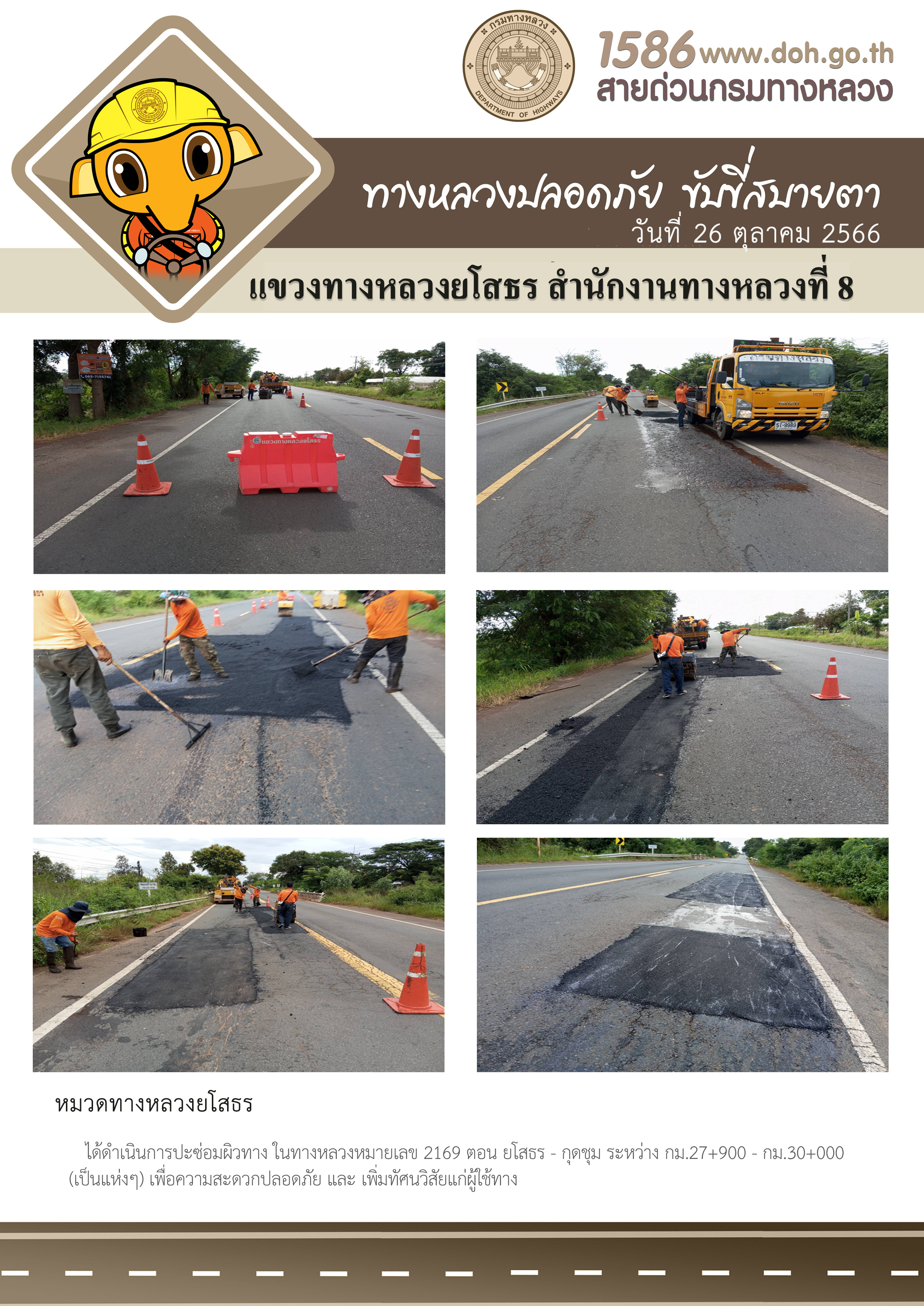 วันที่ 26 ตุลาคม 2566 หมวดทางหลวงยโสธร ได้ดำเนินการปะซ่อมผิวทาง ในทางหลวงหมายเลข 2169 ตอน ยโสธร - กุดชุม ระหว่าง กม.27+900 - กม.30+000 (เป็นแห่งๆ) เพื่อความสะดวกปลอดภัย และเพิ่มทัศนวิสัยแก่ผู้ใช้ทาง