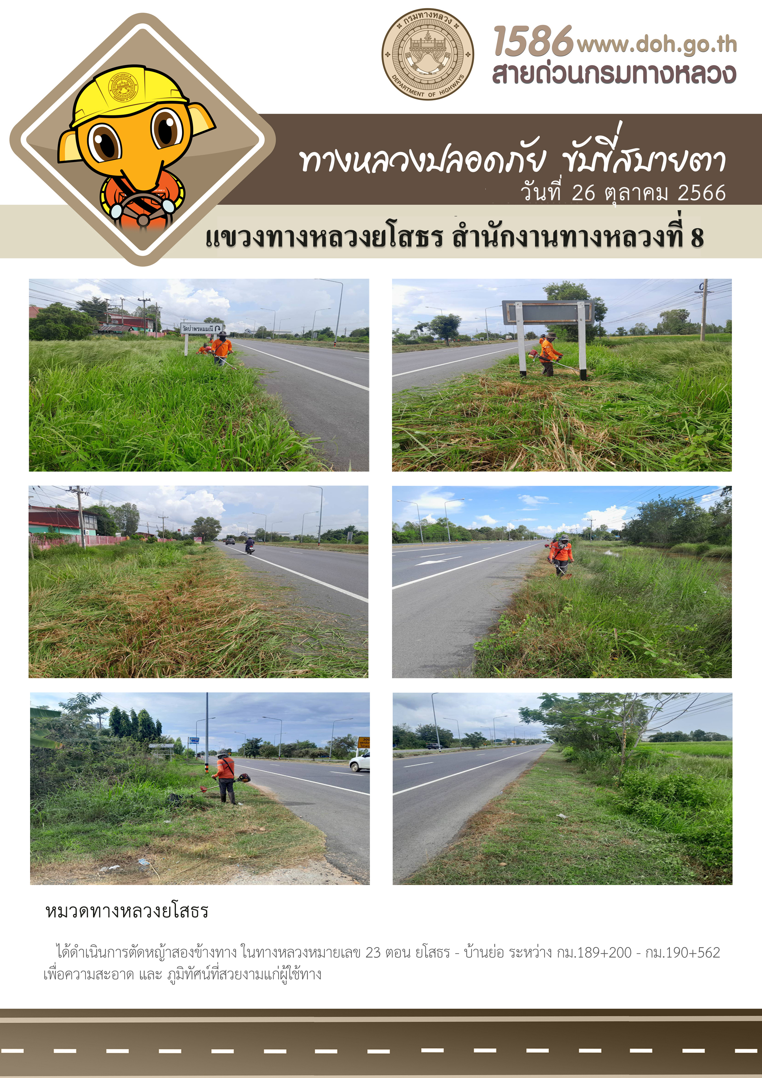 วันที่ 26 ตุลาคม 2566 หมวดทางหลวงยโสธร ได้ดำเนินการตัดหญ้าสองข้างทาง ในทางหลวงหมายเลข 23 ตอน ยโสธร - บ้านย่อ ระหว่าง กม.189+200 - กม.190+562 เพื่อความสะอาด และภูมิทัศน์ที่สวยงามแก่ผู้ใช้ทาง