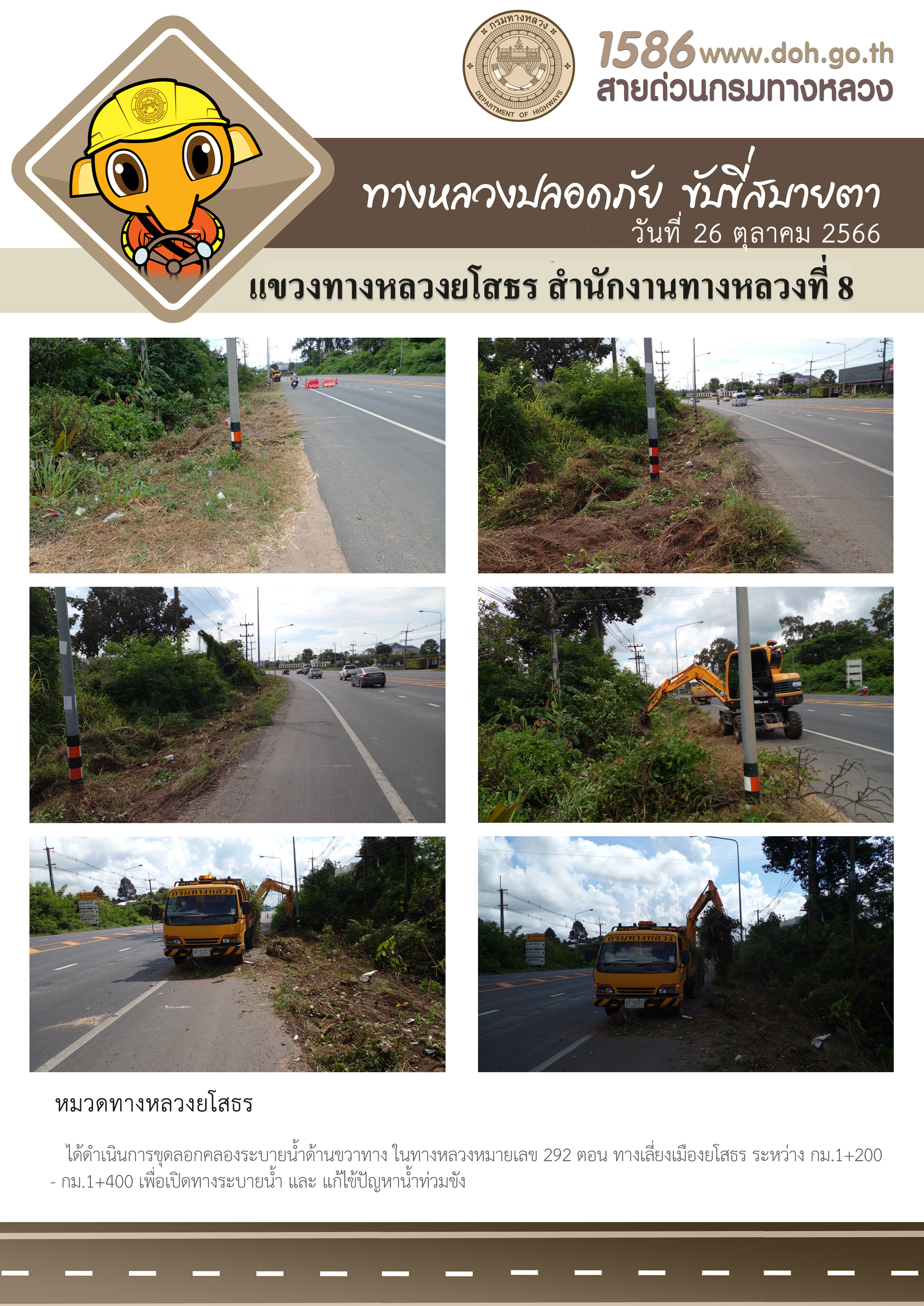วันที่ 26 ตุลาคม 2566 หมวดทางหลวงยโสธร ได้ดำเนินการขุดลอกคลองระบายน้ำด้านขวาทาง ในทางหลวงหมายเลข 292 ตอน ทางเลี่ยงเมืองยโสธร ระหว่าง กม.1+200 - กม.1+400 เพื่อเปิดทางระบายน้ำ และแก้ไข้ปัญหาน้ำท่วมขัง