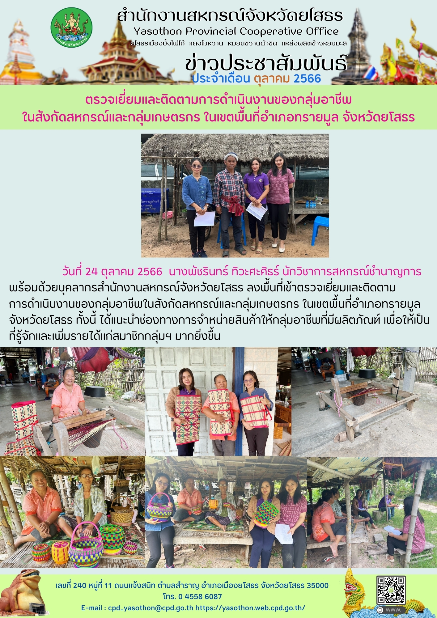 นางพัชรินทร์ ทิวะศะศิธร์ นักวิชาการสหกรณ์ชำนาญการ พร้อมด้วยเจ้าหน้าที่สำนักงานสหกรณ์จังหวัดยโสธร ลงพื้นที่เข้าตรวจเยี่ยมและติดตามการดำเนินงานของกลุ่มอาชีพในจังหวัดยโสธร