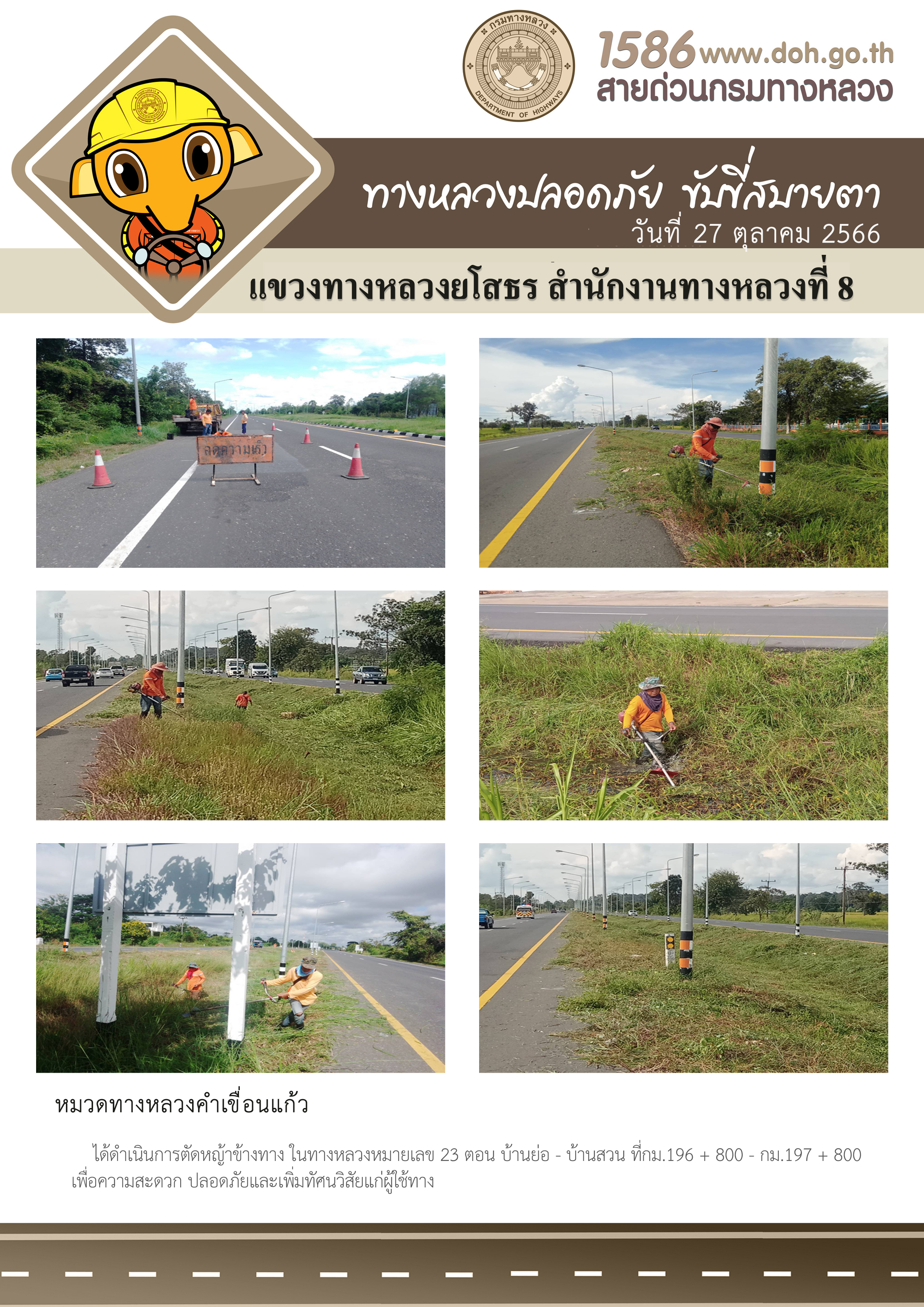วันที่ 27 ตุลาคม 2566 หมวดทางหลวงคำเขื่อนแก้ว ได้ดำเนินการตัดหญ้าข้างทาง ในทางหลวงหมายเลข 23 ตอน บ้านย่อ - บ้านสวน ที่ กม.196 + 800 - กม.197 + 800 เพื่อความสะดวก ปลอดภัยและเพิ่มทัศนวิสัยแก่ผู้ใช้ทาง