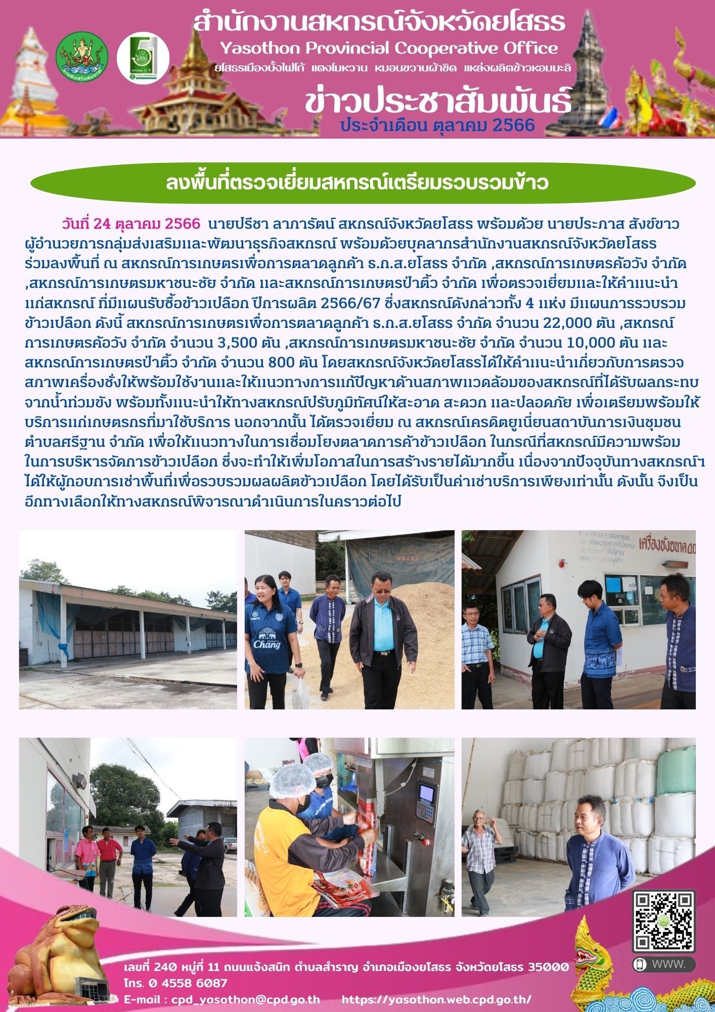 นายปรีชา ลาภารัตน์ สหกรณ์จังหวัดยโสธรพร้อมด้วยเจ้าหน้าที่สำนักงานสหกรณ์จังหวัดยโสธร ลงพื้นที่สหกรณ์ในเขตพื้นที่จังหวัดยโสธร เพื่อตรวจเยี่ยมให้คำแนะนำแก่สหกรณ์ ที่มีแผนรับซื้อข้าวเปลือก ปีการผลิต 2566/67