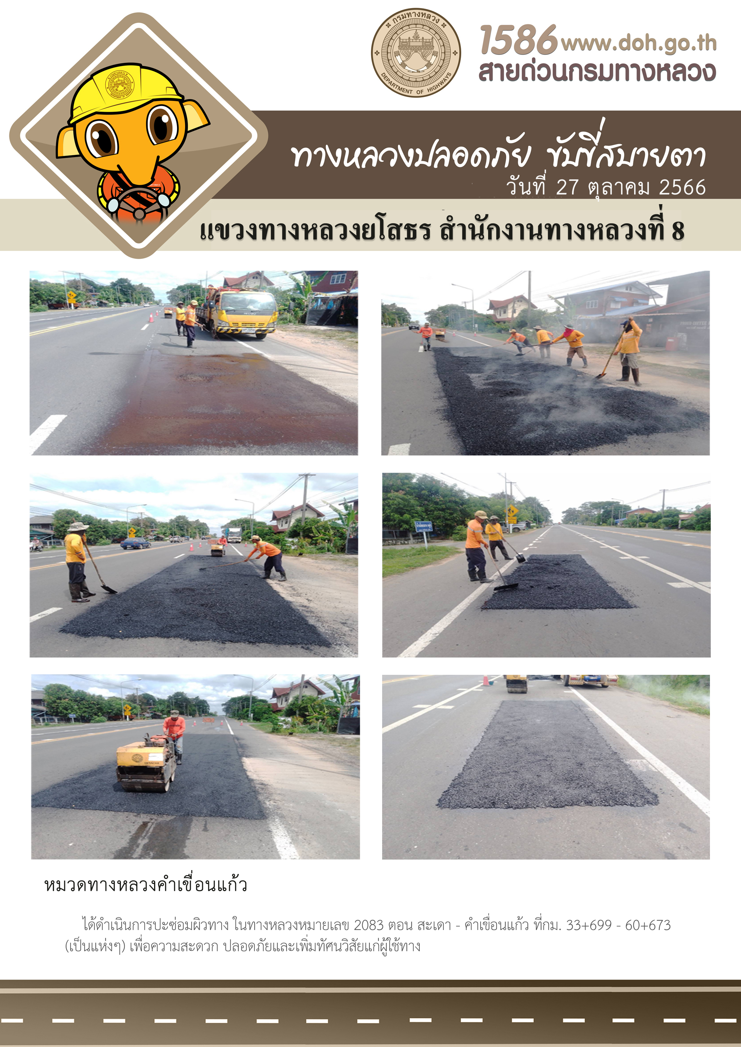 วันที่ 27 ตุลาคม 2566 หมวดทางหลวงคำเขื่อนแก้ว ได้ดำเนินการปะซ่อมผิวทาง ในทางหลวงหมายเลข 2083 ตอน สะเดา - คำเขื่อนแก้ว ที่ กม.33+699 - กม.60+673 (เป็นแห่งๆ) เพื่อความสะดวก ปลอดภัยและเพิ่มทัศนวิสัยแก่ผู้ใช้ทาง