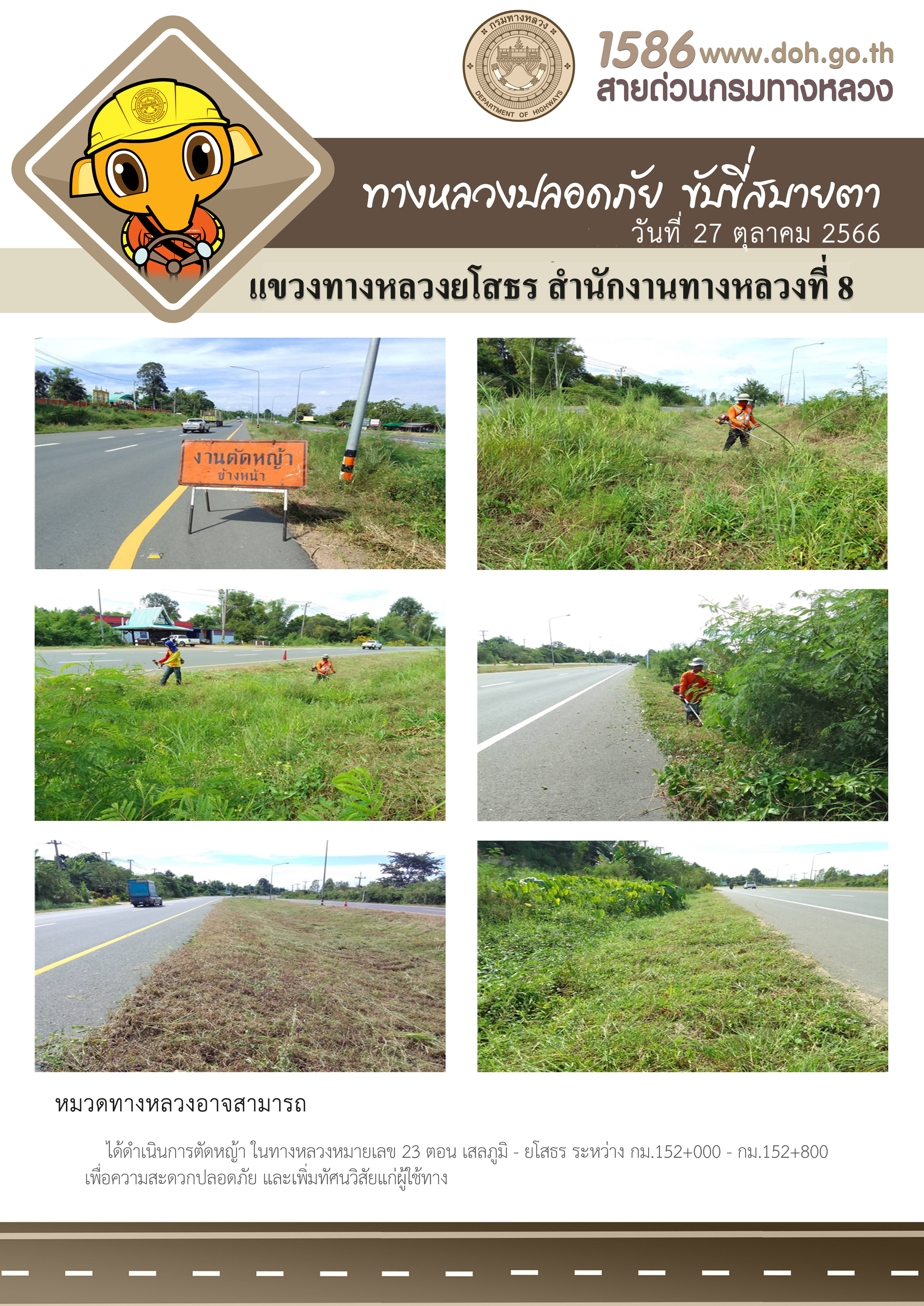 วันที่ 27 ตุลาคม 2566 หมวดทางหลวงอาจสามารถ ได้ดำเนินการตัดหญ้า ในทางหลวงหมายเลข 23 ตอน เสลภูมิ - ยโสธร ระหว่าง กม.152+000 - กม.152+800 เพื่อความสะดวกปลอดภัย และเพิ่มทัศนวิสัยแก่ผู้ใช้ทาง