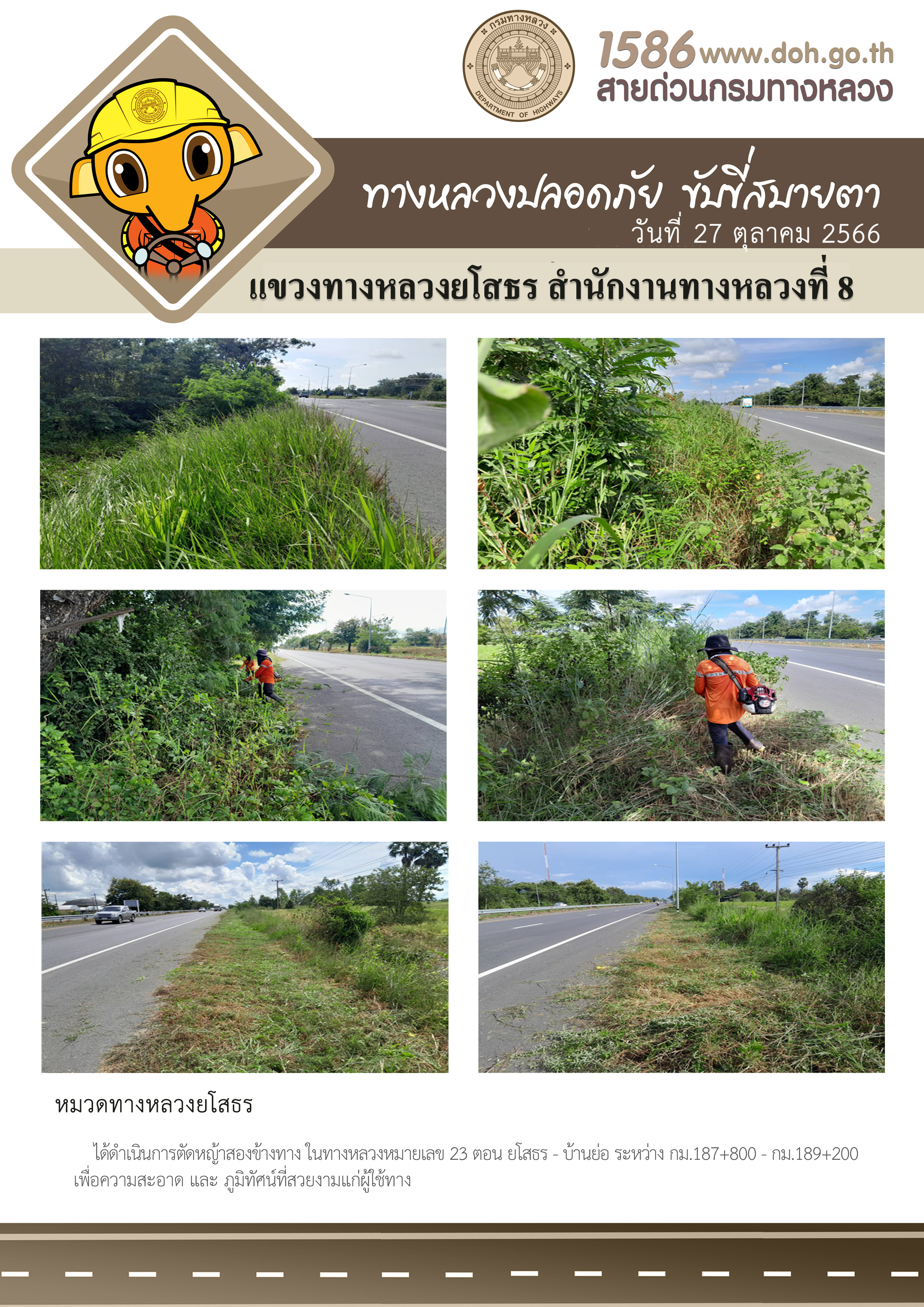 วันที่ 27 ตุลาคม 2566 หมวดทางหลวงยโสธร ได้ดำเนินการตัดหญ้าสองข้างทาง ในทางหลวงหมายเลข 23 ตอน ยโสธร - บ้านย่อ ระหว่าง กม.187+800 - กม.189+200 เพื่อความสะอาด และภูมิทัศน์ที่สวยงามแก่ผู้ใช้ทาง