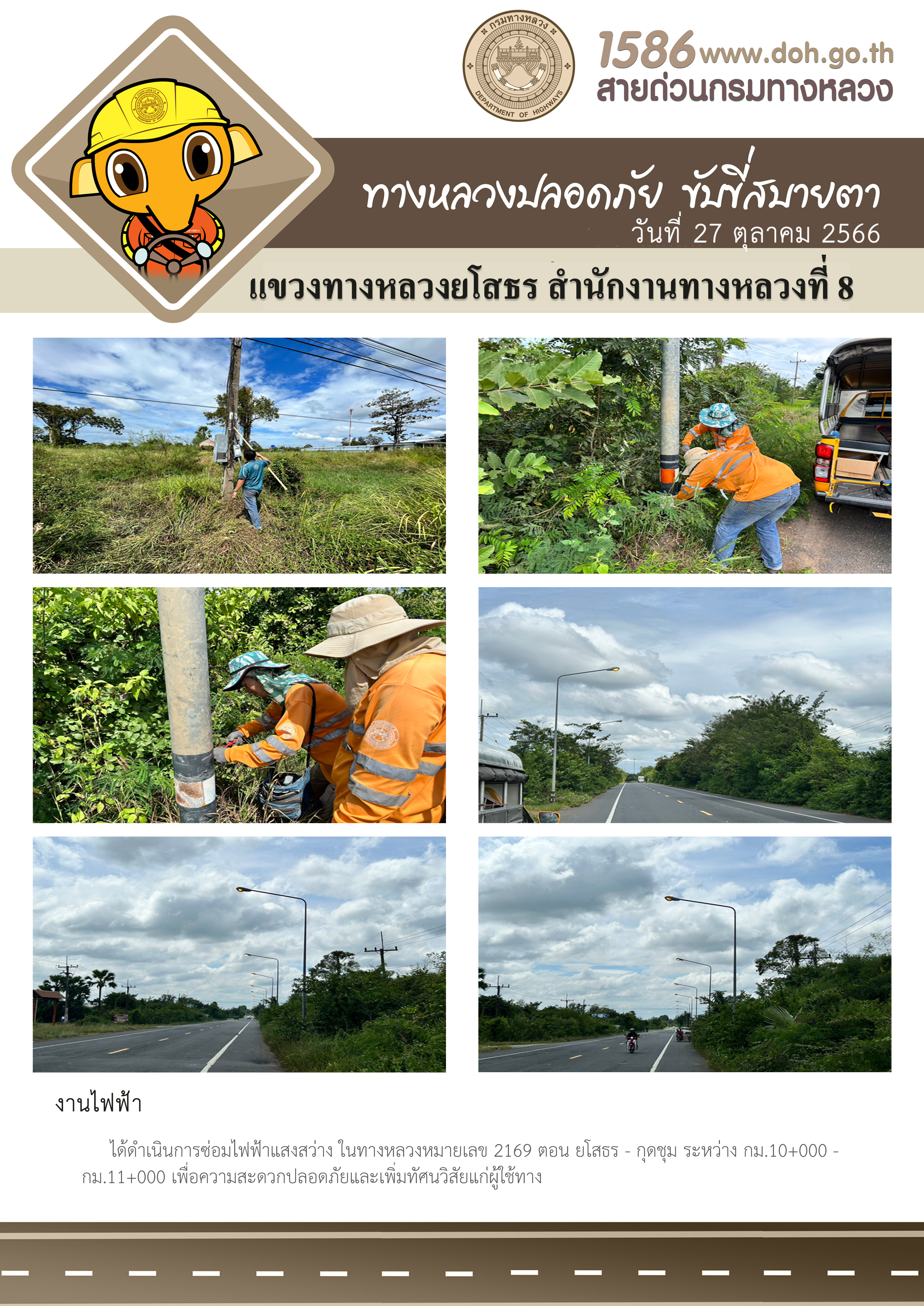 วันที่ 27 ตุลาคม 2566 งานไฟฟ้า ได้ดำเนินการซ่อมไฟฟ้าแสงสว่าง ในทางหลวงหมายเลข 2169 ตอน ยโสธร - กุดชุม ระหว่าง กม.10+000 - กม.11+000 เพื่อความสะดวกปลอดภัยและเพิ่มทัศนวิสัยแก่ผู้ใช้ทาง