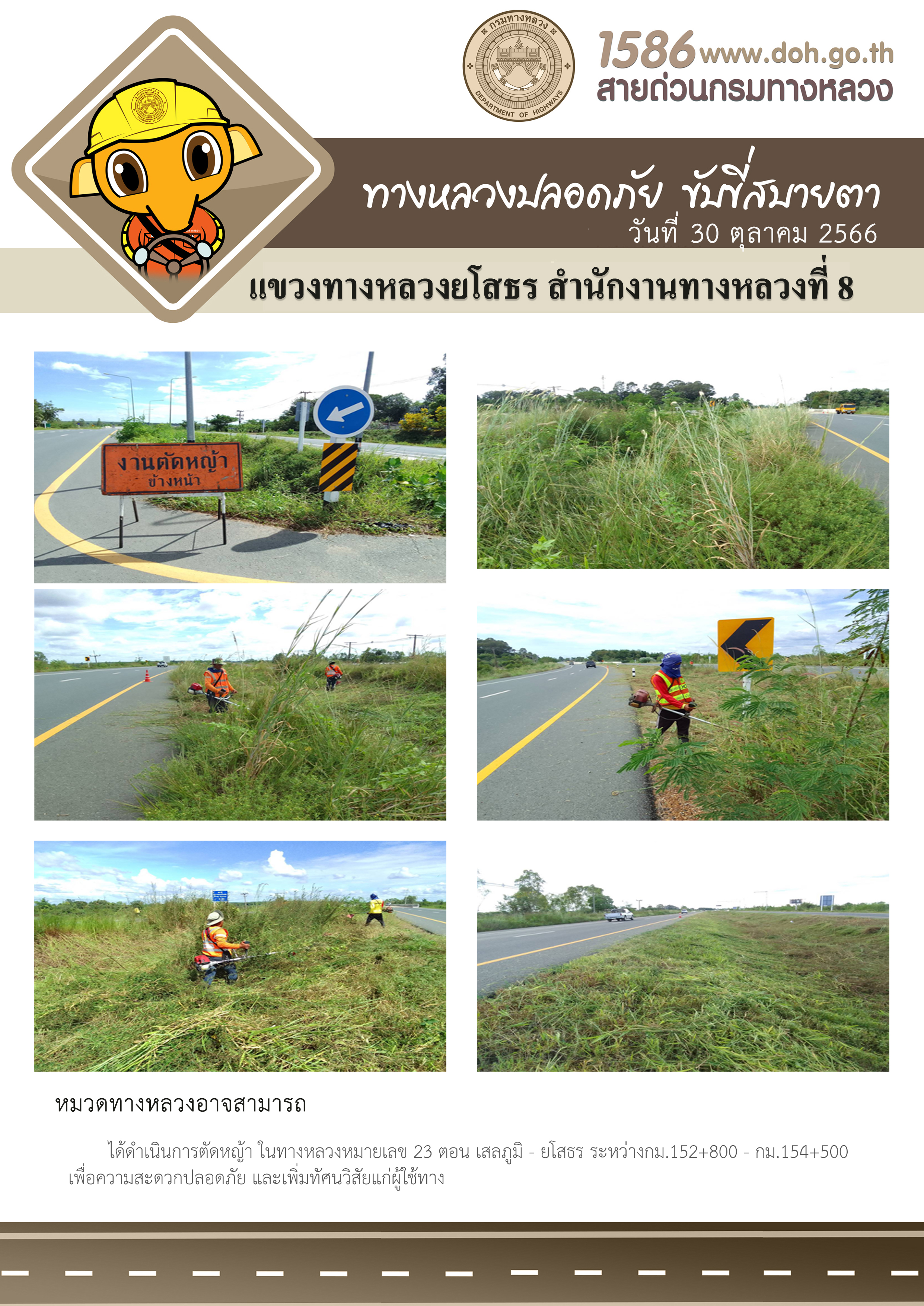 วันที่ 30 ตุลาคม 2566 หมวดทางหลวงอาจสามารถ ได้ดำเนินการตัดหญ้า ในทางหลวงหมายเลข 23 ตอน เสลภูมิ - ยโสธร ระหว่าง กม.152+800 - กม.154+500 เพื่อความสะดวกปลอดภัย และเพิ่มทัศนวิสัยแก่ผู้ใช้ทาง