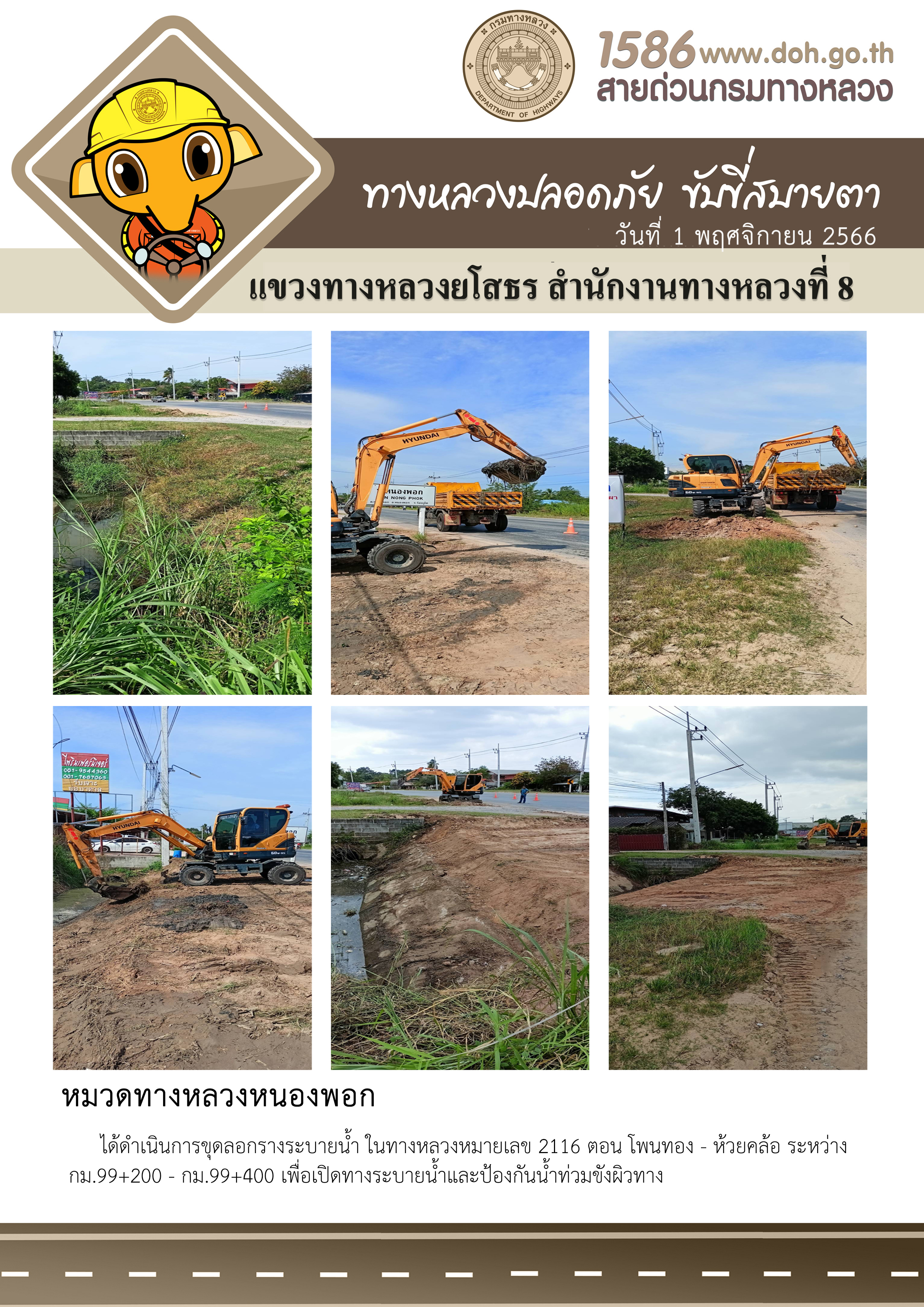 วันที่ 1 พฤศจิกายน 2566 หมวดทางหลวงหนองพอก ได้ดำเนินการขุดลอกรางระบายน้ำ ในทางหลวงหมายเลข 2116 ตอน โพนทอง - ห้วยคล้อ ระหว่าง กม.99+200 - กม.99+400 เพื่อเปิดทางระบายน้ำและป้องกันน้ำท่วมขังผิวทาง