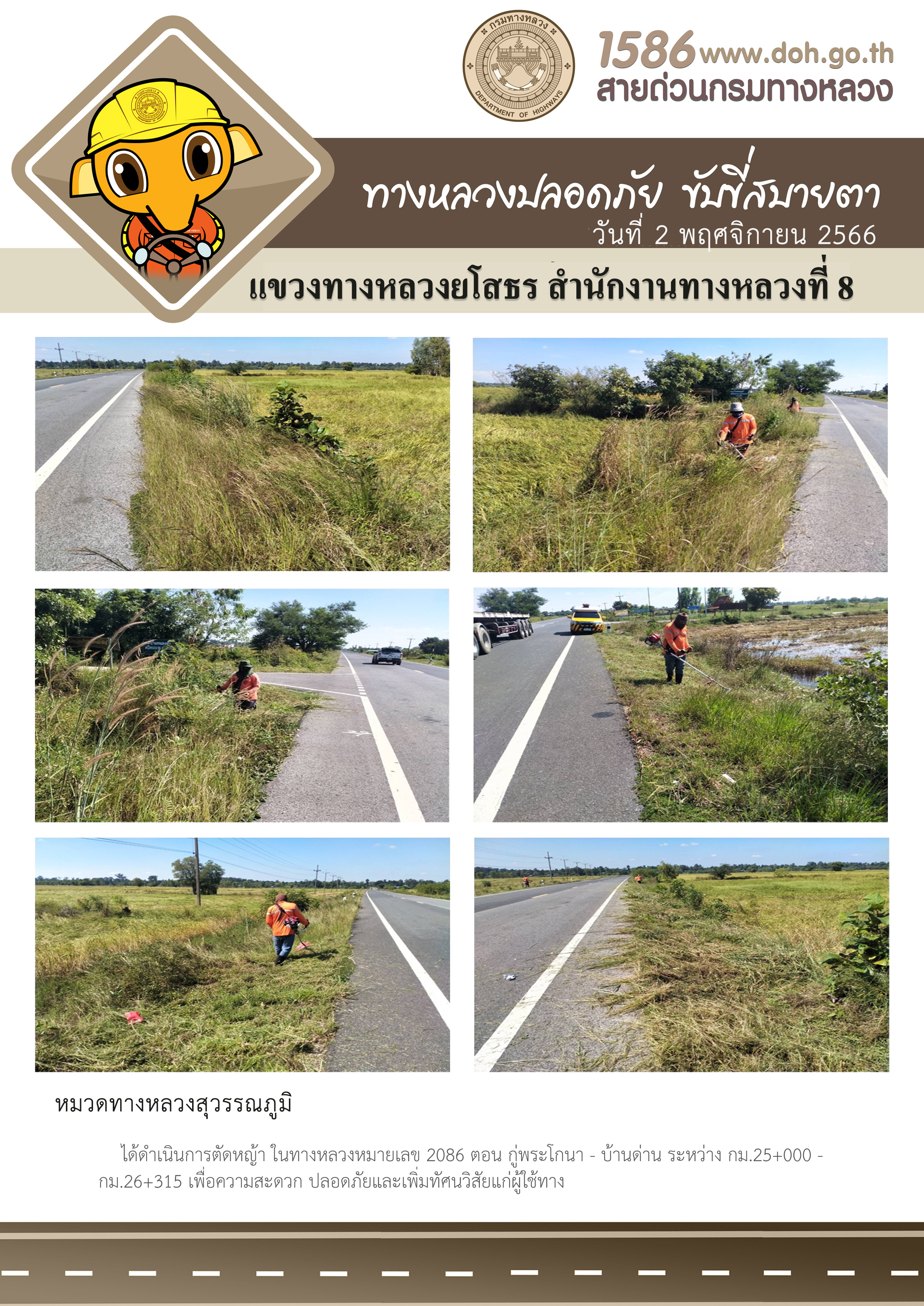 วันที่ 2 พฤศจิกายน 2566 หมวดทางหลวงสุวรรณภูมิ ได้ดำเนินการตัดหญ้า ในทางหลวงหมายเลข 2086 ตอน กู่พระโกนา - บ้านด่าน ระหว่าง กม.25+000 - กม.26+315 เพื่อความสะดวก ปลอดภัยและเพิ่มทัศนวิสัยแก่ผู้ใช้ทาง