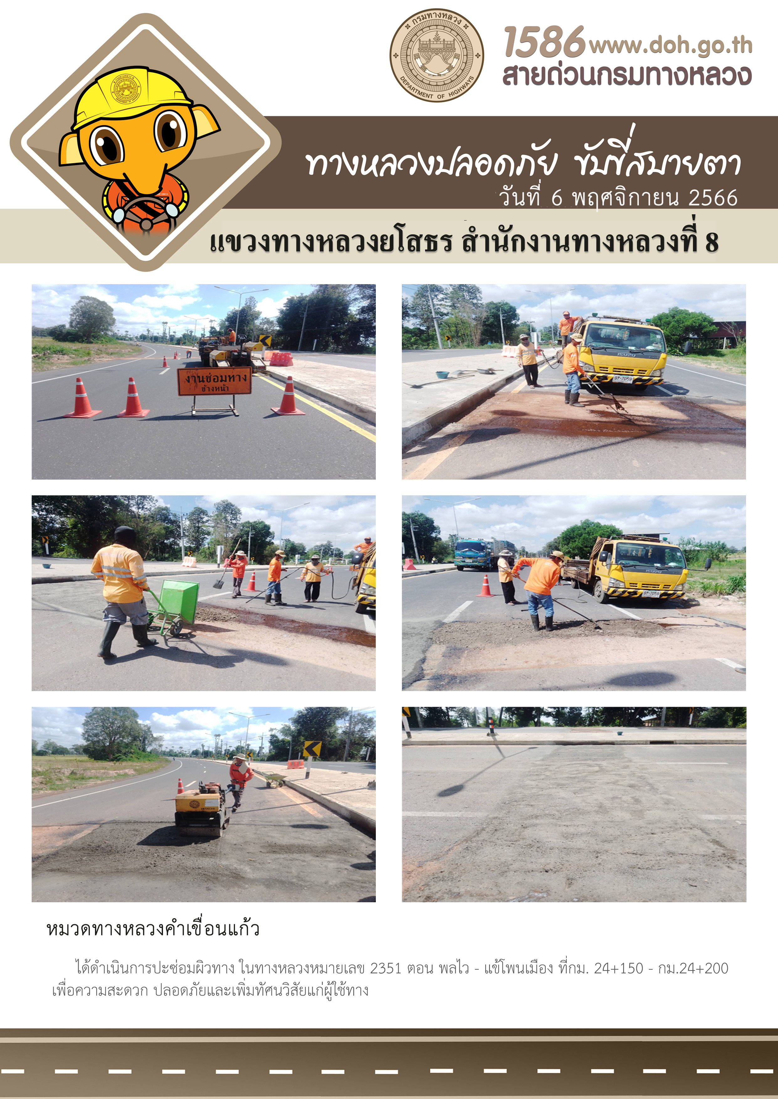 วันที่ 6 พฤศจิกายน 2566 หมวดทางหลวงคำเขื่อนแก้ว ได้ดำเนินการปะซ่อมผิวทาง ในทางหลวงหมายเลข 2351 ตอน พลไว - แข้โพนเมือง ที่ กม.24+150 - กม.24+200 เพื่อความสะดวก ปลอดภัยและเพิ่มทัศนวิสัยแก่ผู้ใช้ทาง