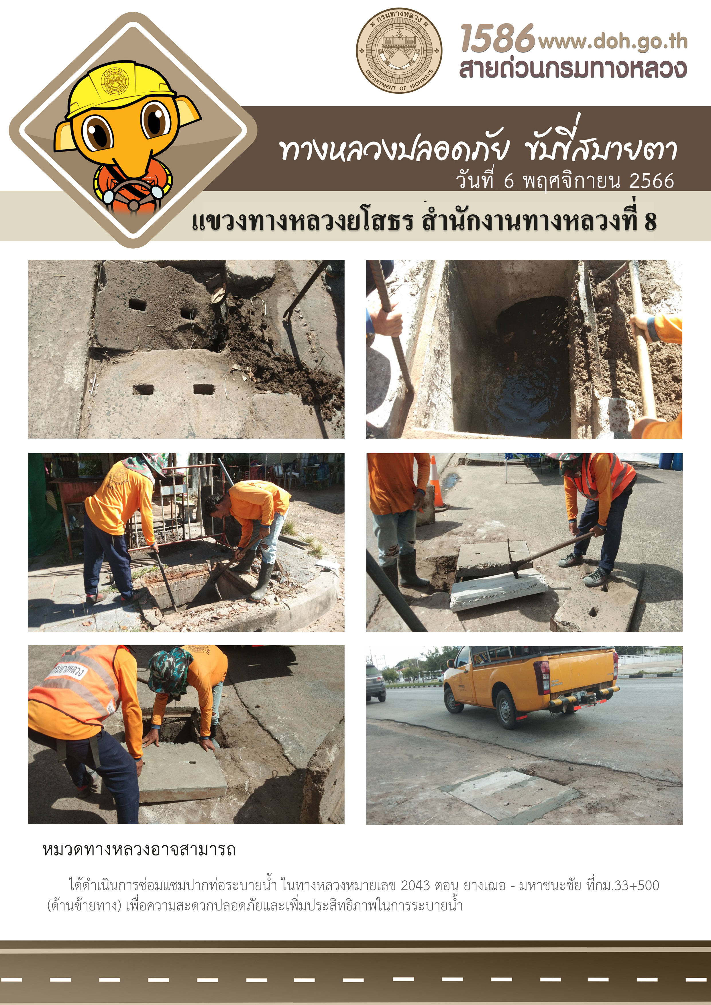 วันที่ 6 พฤศจิกายน 2566 หมวดทางหลวงอาจสามารถ ได้ดำเนินการซ่อมแซมปากท่อระบายน้ำ ในทางหลวงหมายเลข 2043 ตอน ยางเฌอ - มหาชนะชัย ที่ กม.33+500 (ด้านซ้ายทาง) เพื่อความสะดวกปลอดภัยและเพิ่มประสิทธิภาพในการระบายน้ำ