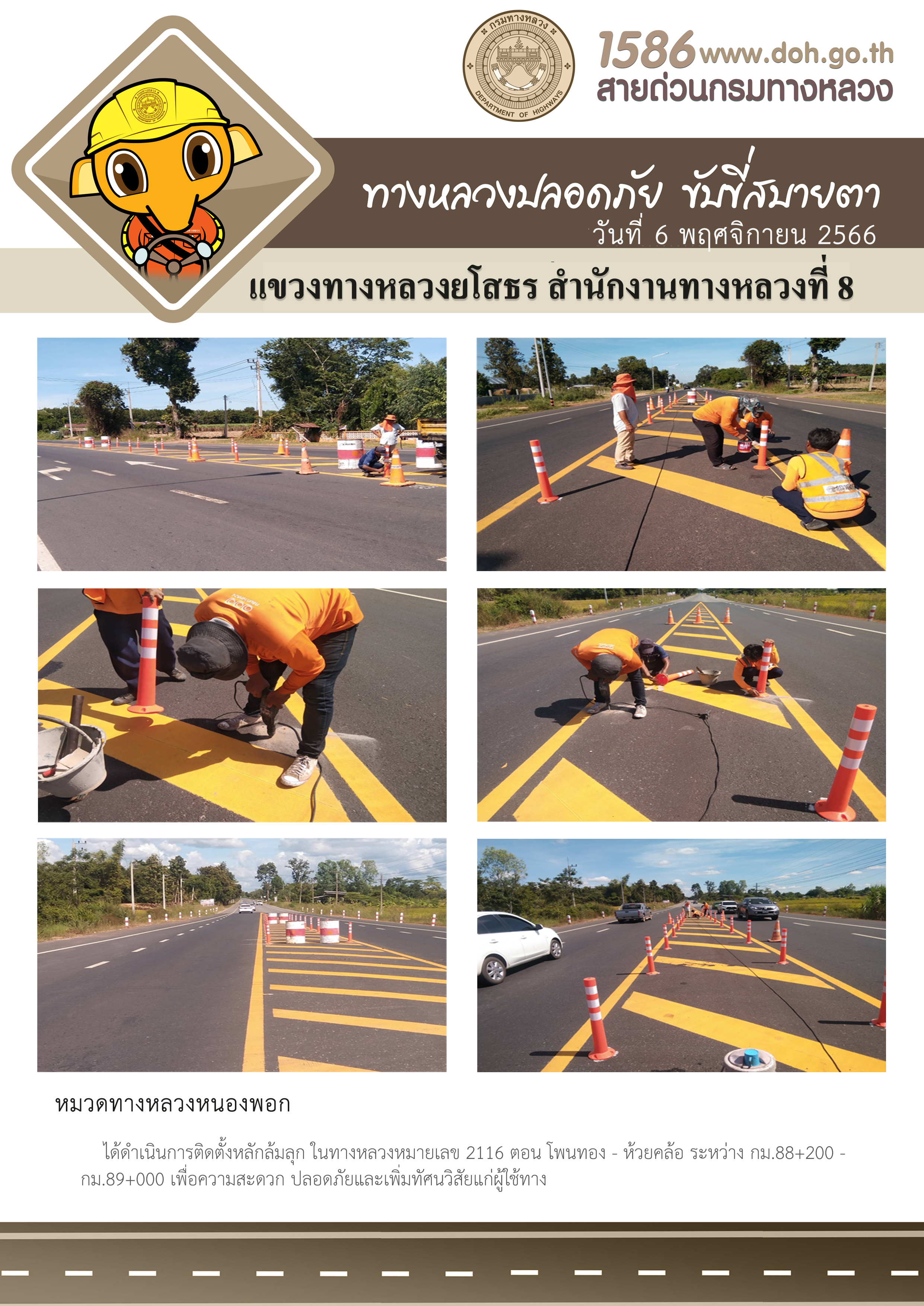 วันที่ 6 พฤศจิกายน 2566 หมวดทางหลวงหนองพอก ได้ดำเนินการติดตั้งหลักล้มลุก ในทางหลวงหมายเลข 2116 ตอน โพนทอง - ห้วยคล้อ ระหว่าง กม.88+200 - กม.89+000 เพื่อความสะดวก ปลอดภัยและเพิ่มทัศนวิสัยแก่ผู้ใช้ทาง
